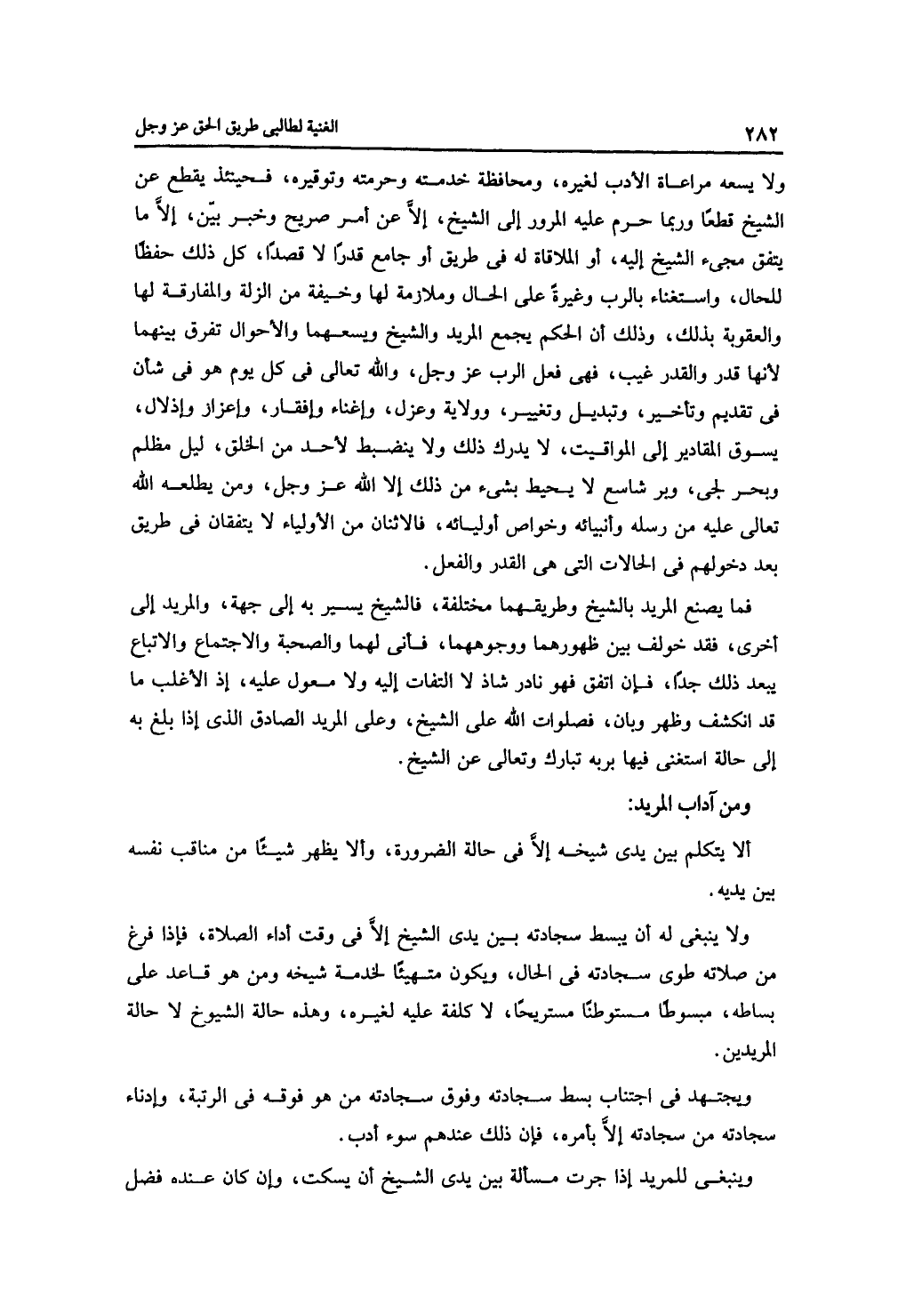 ولا يسعه مراعاة الأدب لغيره، ومحافظة خدمته وحرمته وتوقيره، فحينئذ يقطع عن الشيخ قطعًا وربما حرم عليه المرور إلى الشيخ، إلا عن أمر صريح وخبر بين، إلا ما يتفق مجيء الشيخ إليه، أو الملاقاة له في طريق أو جامع قدرًا لا قصدًا، كل ذلك حفظًا للحال، واستغناء بالرب وغيره على الحال وملازمة لها وخيفة من الزلة والمفارقة لها والعقوبة بذلك، وذلك أن الحكم يجمع المريد والشيخ ويسعهما والأحوال تفرق بينهما لأنها قدر والقدر غيب، فهي فعل الرب عز وجل، والله تعالى في كل يوم هو في شأن في تقديم وتأخير، وتبديل وتغيير، وولاية وعزل، وإغناء وإفقار، وإعزاز وإذلال، يسوق المقادير إلى المواقيت، لا يدرك ذلك ولا ينضبط لأحد من الخلق، ليل مظلم وبحر لجي، وبر شاسع لا يحيط بشيء من ذلك إلا الله عز وجل، ومن يطلعه الله تعالى عليه من رسله وأنبيائه وخواص أوليائه، فالاثنان من الأولياء لا يتفقان في طريق بعد دخولهم في الحالات التي هي القدر والفعل.