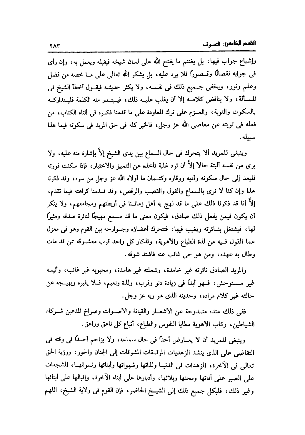 وينبغي للمريد أن لا يعارض أحدًا في حال سماعه، ولا يزاحم أحدًا في وقته في التقاضي على الذي ينشد الزهديات المرققات المشوقات إلى الجنان والحور، ورؤية الحق تعالى في الآخرة، المزهدات في الدنيا ولذاتها وشهواتها وأبنائها ونسوانها، المشجعات على الصبر على آفاتها ومحنها وبلائها، وأدبارها على أبناء الآخرة، وإقبالها على أبنائها وغير ذلك، فليكل جميع ذلك إلى الشيخ الحاضر، فإن القوم في ولاية الشيخ، اللهم