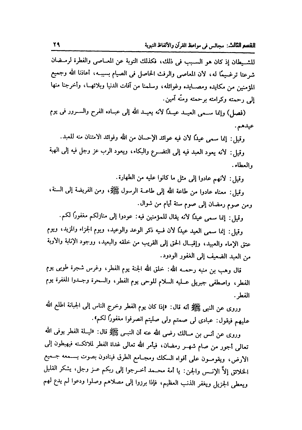 وروى عن أنس بن مالك -رضي الله عنه -أن النبي -صلى الله عليه وسلم -قال: "ليلة الفطر يوفى الله تعالى أجور من صام شهر رمضان، فيأمر الله تعالى غداة الفطر لملائكته فيهبطون إلى الأرض، ويقومون على أفواه السكك ومجامع الطرق فينادون بصوت يسمعه جميع الخلائق إلا الإنس والجن: يا أمة محمد أخرجوا إلى ربكم -عز وجل -، يشكر القليل ويعطى الجزيل ويغفر الذنب العظيم، فإذا برزوا إلى مصلاهم وصلوا ودعوا لم يدع لهم