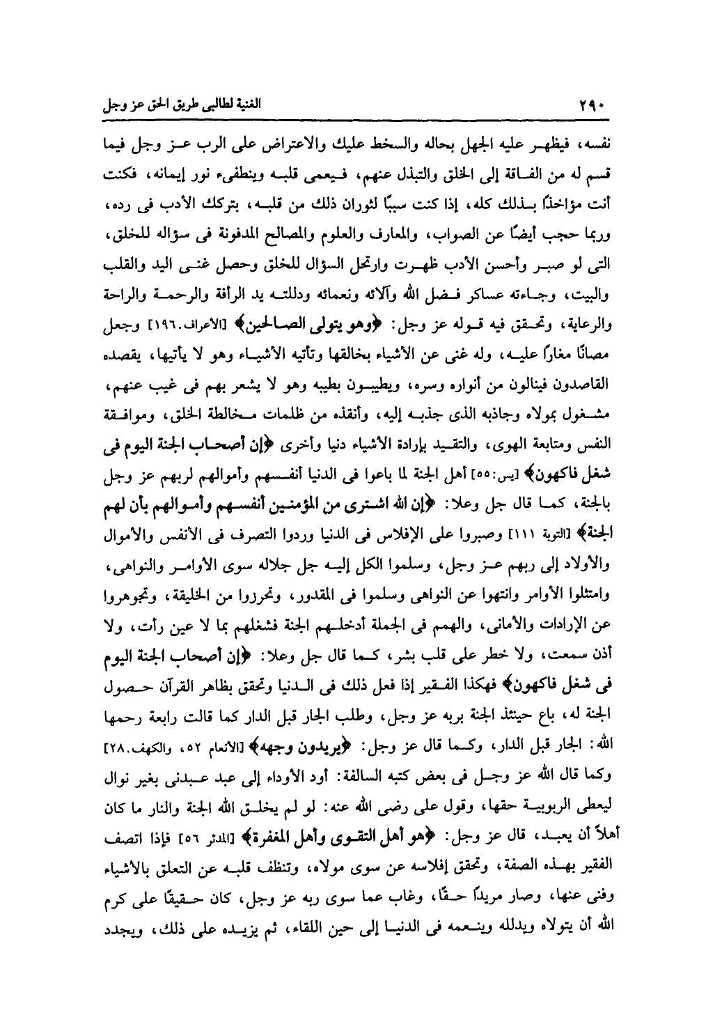نفسه، فيظهر عليه الجهل بحاله والسخط عليك والاعتراض على الرب عز وجل فيما قسم له من الفاقة إلى الخلق والتبذل عنهم، فيعمى قلبه وينطفئ نور إيمانه، فكنت أنت مؤاخذًا بذلك كله، إذا كنت سببًا لثوران ذلك من قلبه، بتركك الأدب في رده، وربما حجب أيضًا عن الصواب، والمعارف والعلوم والمصالح المدفونة في سؤاله للخلق، التي لو صبر وأحسن الأدب ظهرت وارتحل السؤال للخلق وحصل غنى اليد والقلب والبيت، وجاءته عساكر فضل الله وآلائه ونعمائه ودللته يد الرأفة والرحمة والراحة والرعاية، وتحقق فيه قوله عز وجل: {وهو يتولى الصالحين} [الأعراف: 196] وجعل مصانًا مغارًا عليه، وله غنى عن الأشياء بخالقها وتأتيه الأشياء وهو لا يأتيها، يقصده القاصدون فينالون من أنواره وسره، ويطيبون بطيبه وهو لا يشعر بهم في غيب عنهم، مشغول بمولاه وجاذبه الذي جذبه إليه، وأنقذه من ظلمات مخالطة الخلق، وموافقة النفس ومتابعة الهوى، والتقيد بإرادة الأشياء دنيا وأخرى {إن أصحاب الجنة اليوم في شغل فاكهون} [يس: 55] أهل الجنة لما باعوا في الدنيا أنفسهم وأموالهم لربهم عز وجل بالجنة، كما قال جل وعلا: {إن الله اشترى من المؤمنين أنفسهم وأموالهم بأن لهم الجنة} [التوبة:111] وصبروا على الإفلاس في الدنيا وردوا التصرف في الأنفس والأموال والأولاد إلى ربهم عز وجل، وسلموا الكل إليه جل جلاله سوى الأوامر والنواهي، وامتثلوا الأوامر وانتهوا عن النواهي وسلموا في المقدور، وتحرزوا من الخليقة، وتجوهروا عن الإرادات والأماني، والهمم في الجملة أدخلهم الجنة فشغلهم بما لا عين رأت، ولا أذن سمعت، ولا خطر على قلب بشر، كما قال جل وعلا: {إن أصحاب الجنة اليوم في شغل فاكهون} فهكذا الفقير إذا فعل ذلك في الدنيا وتحقق بظاهر القرآن حصول الجنة له، باع حينئذ الجنة بربه عز وجل، وطلب الجار قبل الدار كما قالت رابعة رحمها الله: الجار قبل الدار، وكما قال عز وجل: {يريدون وجهه} [الأنعام: 52، والكهف: 28] وكما قال الله عز وجل في بعض كتبه السالفة: أود الأوداء إلى عبد عبدني بغير نوال ليعطي الربوبية حقها، وقول على رضي الله عنه: لو لم يخلق الله الجنة والنار ما كان أهلاً أن يعبد، قال عز وجل: {هو أهل التقوى وأهل المغفرة} [المدثر: 56] فإذا اتصف الفقير بهذه الصفة، وتحقق إفلاسه عن سوى مولاه، وتنظف قلبه عن التعلق بالأشياء وفنى عنها، وصار مريدًا حقًا، وغاب عما سوى ربه عز وجل، كان حقيقًا على كرم الله أن يتولاه ويدلله وينعمه في الدنيا إلى حين اللقاء، ثم يزيده على ذلك، ويجدد