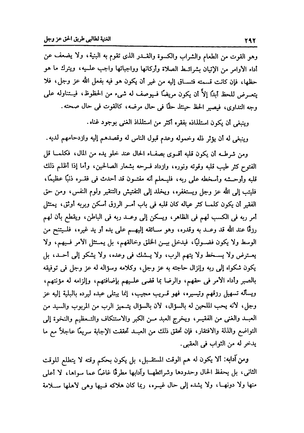 ومن شرطه أن يكون قلبه أقوى بصفاء الحال عند خلو يده من المال، فكلما قل الفتوح كثر طيب قلبه وقوته ونوره، وازداد فرحه بشعار الصالحين، وأما إذا أظلم ذلك قلبه وأوحشه وأسخطه على ربه، فليعلم أنه مفتون قد أحدث في فقره ذنبًا عظيمًا، فليتب إلى الله عز وجل ويستغفره، ويخلد إلى التفتيش والتنقير ولوم النفس، ومن حق الفقير أن يكون كلما كثر عياله كان قلبه في باب أمر الرزق أسكن وبربه أوثق، يتمثل أمر ربه في الكسب لهم في الظاهر، ويسكن إلى وعد ربه في الباطن، ويقطع بأن لهم رزقًا عند الله قد وعد به وقدره، وهو سائقه إليهم على يده أو يد غيره، فليتنح من الوسط ولا يكون فضوليًا، فيدخل بين الخلق وخالقهم، بل يمتثل الأمر فيهم، ولا يعترض ولا يسخط ولا يتهم الرب، ولا يشك في وعده، ولا يشكو إلى أحد، بل يكون شكواه إلى ربه وإنزال حاجته به عز وجل، وكلامه وسؤاله له عز وجل في توفيقه بالصبر وأداء الأمر في حقهم، والرضا بما قضى عليهم بإضافتهم، وإلزامه له مؤنتهم، ويسأله تسهيل رزقهم وتيسيره، فهو قريب مجيب، إنما يبتلى عبده ليرده بالبلية إليه عز وجل، لأنه يحب الملحين له بالسؤال، لأن بالسؤال يتميز الرب من المربوب والسيد من العبد والغنى من الفقير، ويخرج العبد من الكبر والاستنكاف والتعظيم والنخوة إلى التواضع والذلة والافتقار، فإن تحقق ذلك من العبد تحققت الإجابة سريعًا عاجلاً مع ما يدخر له من الثواب في العقبى.