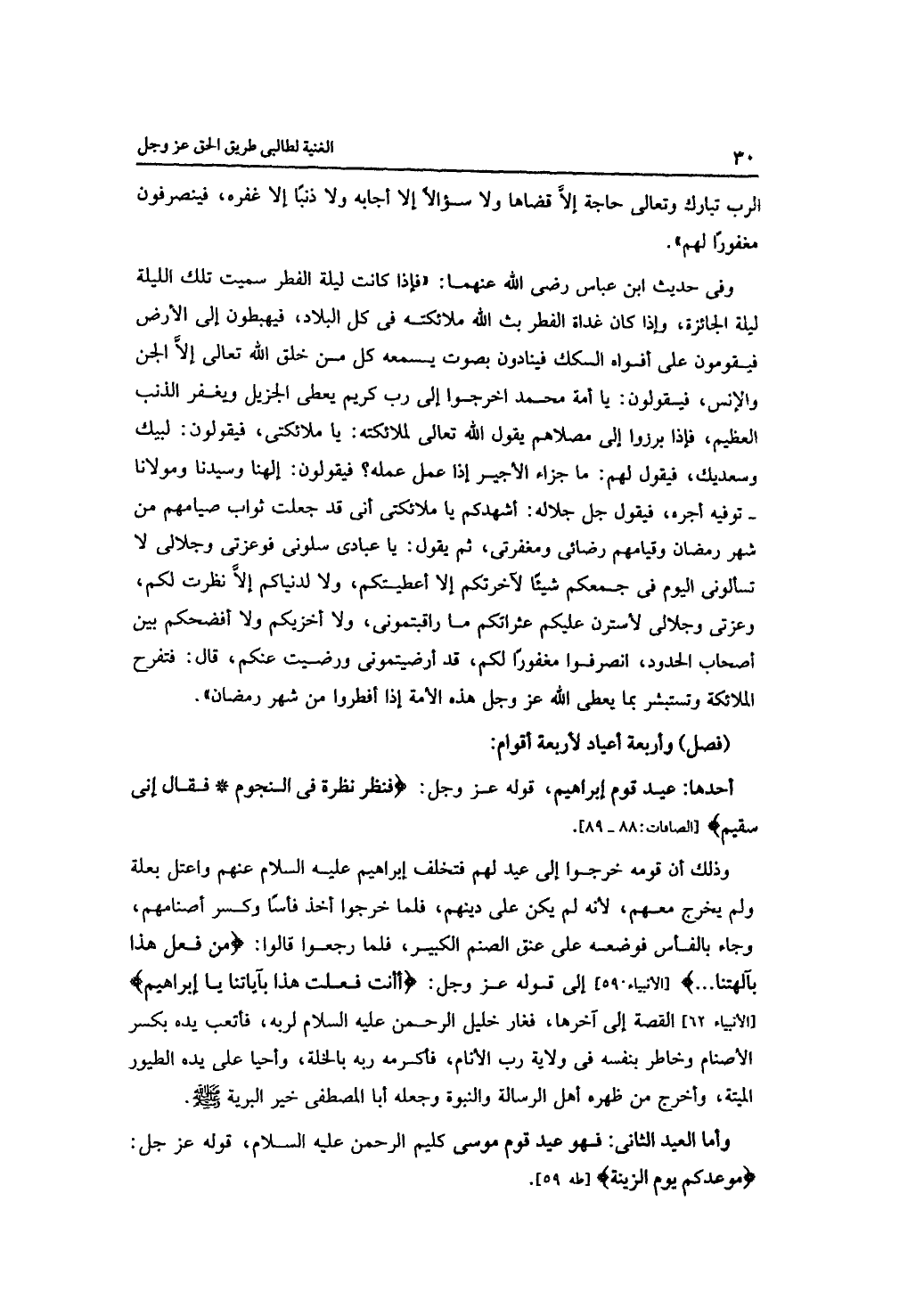 وفي حديث ابن عباس -رضي الله عنهما -: "فإذا كانت ليلة الفطر سميت تلك الليلة ليلة الجائزة، وإذا كان غداة الفطر بث الله ملائكته في كل البلاد، فيهبطون إلى الأرض فيقومون على أفواه السكك فينادون بصوت يسمعه كل من خلق الله تعالى إلا الجن والإنس، فيقولون: يا أمة محمد اخرجوا إلى رب كريم يعطى الجزيل ويغفر الذنب العظيم، فإذا برزوا إلى مصلاهم يقول الله تعالى لملائكته: يا ملائكتي، فيقولون: لبيك وسعديك، فيقول لهم: ما جزاء الأجير إذا عمل عمله؟ فيقولون: إلهنا وسيدنا ومولانا -توفيه أجره، فيقول جل جلاله: أشهدكم يا ملائكتي أني قد جعلت ثواب صيامهم من شهر رمضان وقيامهم رضائي ومغفرتي، ثم يقول: يا عبادي سلوني فوعزتي وجلالي لا تسألوني اليوم في جمعكم شيئًا لآخرتكم إلا أعطيتكم، ولا لدنياكم إلا نظرت لكم، وعزتي وجلالي لأسترن عليكم عثراتكم ما راقبتموني، ولا أخزيكم ولا أفضحكم بين أصحاب الحدود، انصرفوا مغفورًا لكم، قد أرضيتموني ورضيت عنكم، قال: فتفرح الملائكة وتستبشر بما يعطى الله -عز وجل -هذه الأمة إذا أفطروا من شهر رمضان".