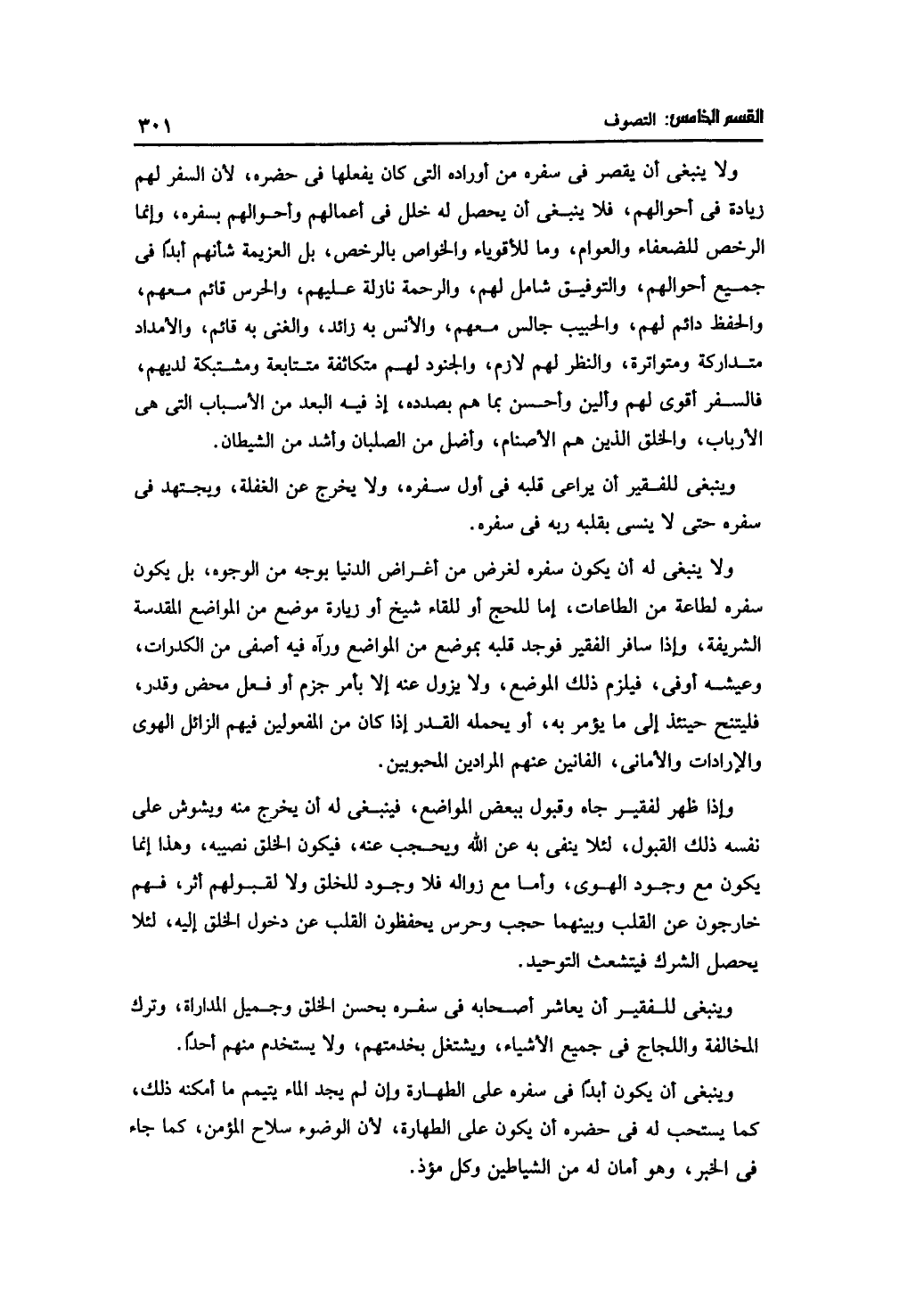 ولا ينبغي أن يقصر في سفره من أوراده التي كان يفعلها في حضره، لأن السفر لهم زيادة في أحوالهم، فلا ينبغي أن يحصل له خلل في أعمالهم وأحوالهم بسفره، وإنما الرخص للضعفاء والعوام، وما للأقوياء والخواص بالرخص، بل العزيمة شأنهم أبدًا في جميع أحوالهم، والتوفيق شامل لهم، والرحمة نازلة عليهم، والحرس قائم معهم والحفظ دائم لهم، والحبيب جالس معهم، والأنس به زائد، والغنى بهم قائم، والأمداد متداركة ومتواترة، والنظر لهم لازم، والجنود لهم متكاثفة متتابعة ومشتبكة لديهم، فالسفر أقوى لهم وألين وأحسن بما هم بصدده، إذ فيه البعد من الأسباب التي هي الأرباب، والخلق الذين هم الأصنام، وأضل من الصلبان وأشد من الشيطان.