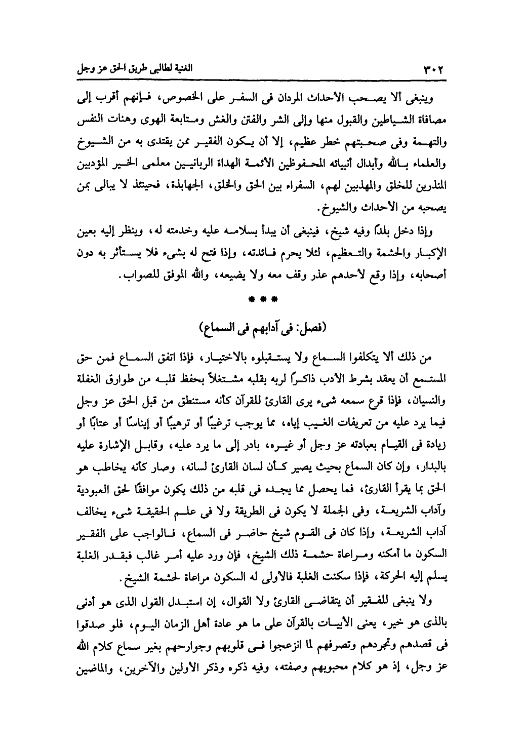 من ذلك الا يتكلفوا السماع ولا يستقبلوه بالاختيار، فإذا اتفق السماع فمن حق المستمع أن يقعد بشرط الأدب ذاكرًا لربه بقلبه مشتغلاً بحفظ قلبه من طوارق الغفلة والنسيان، فإذا قرع سمعه شيء يرى القارئ للقرآن كأنه مستنطق من قبل الحق عز وجل فيما يرد عليه من تعريفات الغيب إياه، مما يوجب ترغيبًا أو ترهيبًا أو إيناسًا أو عتابًا أو زيادة في القيام بعبادته عز وجل أو غيره، بادر إلى ما يرد عليه، وقابل الإشارة عليه بالبدار، وإن كان السماع بحيث يصير كأن لسان القارئ لسانه، وصار كأنه يخاطب هو الحق بما يقرأ القارئ، فما يحصل مما يجده في قلبه من ذلك يكون موافقًا لحق العبودية وآداب الشريعة، وفي الجملة لا يكون في الطريقة ولا في علم الحقيقة شيء يخالف آداب الشريعة، وإذا كان في القوم شيخ حاضر في السماع، فالواجب على الفقير السكون ما أمكنه ومراعاة حشمة ذلك الشيخ، فإن ورد عليه أمر غالب فبقدر الغلبة يسلم إليه الحركة، فإذا سكنت الغلبة فالأولى له السكون مراعاة لحشمة الشيخ.