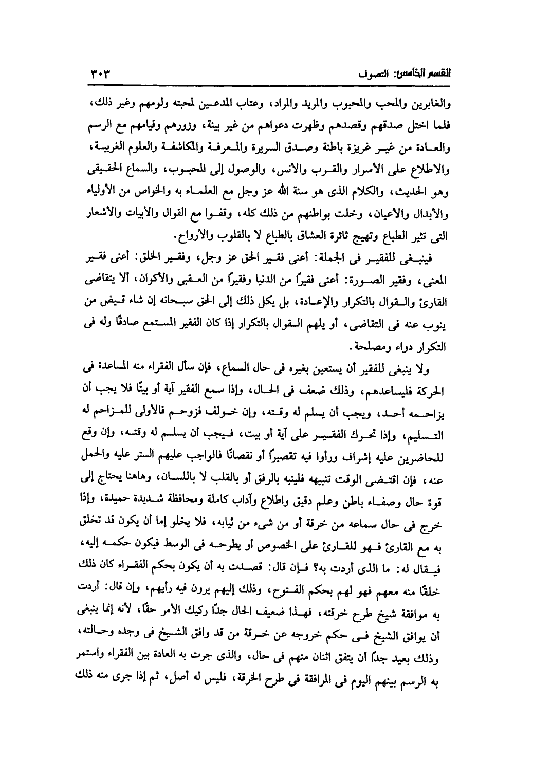 فينبغي للفقير في الجملة: أعني فقير الحق عز وجل، وفقير الخلق: أعني فقير المعنى، وفقير الصورة: أعني فقيرًا من الدنيا وفقيرًا من العقبى والأكوان، ألا يتقاضى القارئ وا لقول بالتكرار والإعادة، بل يكل ذلك إلى الحق سبحانه إن شاء قبض من ينوب عنه في التقاضي، أو يلهم القوال بالتكرار إذا كان الفقير المستمع صادقًا وله في التكرار دواء ومصلحة.