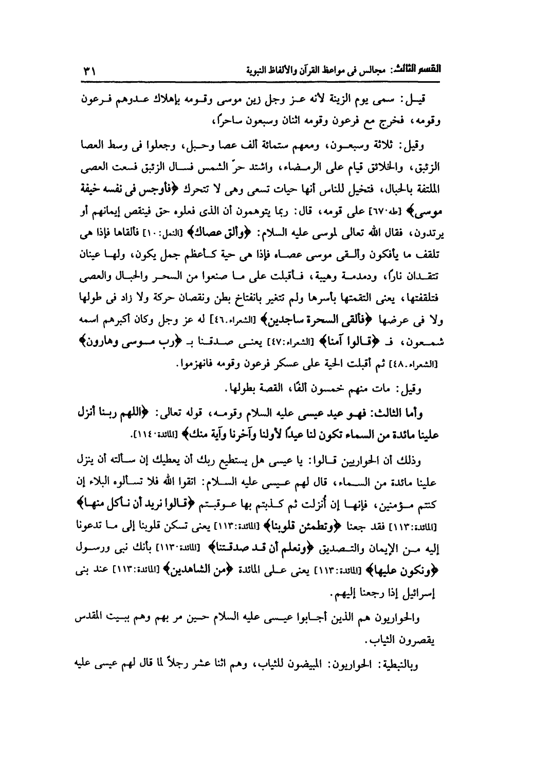 وأما الثالث: فهو عيد عيسى -عليه السلام -وقومه، قوله تعالى: {اللهم ربنا أنزل علينا مائدة من السماء تكون لنا عيدًا لأولنا وآخرنا وآية منك} [المائدة: 114].