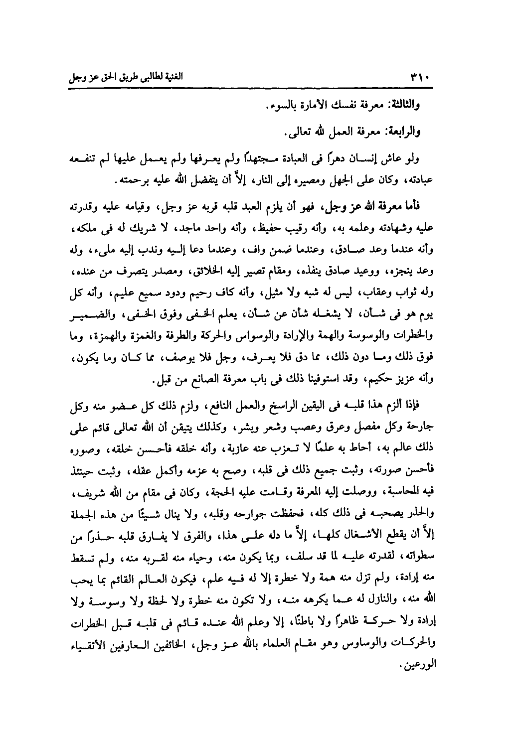 فأما معرفة الله عز وجل، فهو أن يلزم العبد قلبه قربه عز وجل، وقيامه عليه وقدرته عليه وشهادته وعلمه به، وأنه رقيب حفيظ، وأنه واحد ماجد، لا شريك له في ملكه، وأنه عندما وعد صادق، وعندما ضمن واف، وعندما دعا إليه وندب إليه مليء، وله وعد ينجزه، ووعيد صادق ينفذه، ومقام تصير إليه الخلائق، ومصدر يتصرف من عنده، وله ثواب وعقاب، ليس له شبه ولا مثيل، وأنه كاف رحيم ودود سميع عليم، وأنه كل يوم هو في شأن، لا يشغله شأن عن شأن، يعلم الخفي وفوق الخفي، والضمير والخطوات الوسوسة والهمة والإرادة والوسواس والحركة والطرفة والغمزة والهمزة، وما فوق ذلك وما دون ذلك، مما دق فلا يعرف، وجل فلا يوصف، مما كان وما يكون وأنع عزيز حكيم، وقد استوفينا ذلك في باب معرفة الصانع من قبل.