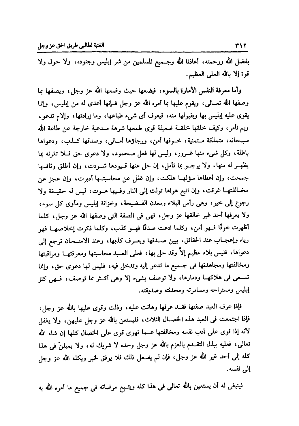 وأما معرفة النفس الأمارة بالسوء، فيضعها حيث وضعها الله عز وجل، ويصفها بما وصفها الله تعالى، ويقوم عليها بما أمره الله عز وجل فإنها أعدى له من إبليس، وإنما يقوى عليه إبليس بها وبقبولها منه، فيعرف أي شيء طباعها، وما إرادتها، وإلام تدعو، وبم تأمر، وكيف خلقها خلقة ضعيفة قوي طمعها شرهة مدعية خارجة عن طاعة الله سبحانه، متملكة متمنية، خوفها أمن، ورجاؤها أماني، وصدقها كذب، ودعواها باطلة، وكل شيء منها غرور، وليس لها فعل محمود، ولا دعوى حق فلا تغرنه بما يظهر له منها، ولا يرجو بما تأمل، إن حل عنها قيودها شردت، وإن أطلق وثاقها جمحت، وإن أعطاها سؤلها هلكت، وإن غفل عن محاسبتها أدبرت، وإن عجز عن مخالفتها غرقت، وإن اتبع هواها تولت إلى النار وفيها هوت، ليس له حقيقة ولا رجوع إلى خير، وهي رأس البلاء ومعدن الفضيحة، وخزانة إبليس ومأوى كل سوء، ولا يعرفها أحد غير خالقها عز وجل، فهي في الصفة التي وصفها الله عز وجل، كلما أظهرت خوفًا فهو أمن، وكلما ادعت صدقًا فهو كذب، وكلما ذكرت إخلاصها فهو رياء وإعطاء عند الحقائق، يبين صدقها ويعرف كذبها، وعند الامتحان يرجع إلى دعواها، فليس بلاء عظيم إلا وقد حل بها، فعلى العبد محاسبتها ومعرفتها ومراقبتها ومخالفتها ومجاهدتها في جميع ما تدعو إليه وتدخل فيه، فليس لها دعوى حق، وإنما تسعى في هلاكها ودمارها، ولا توصف بشيء إلا وهي أكثر مما توصف، فهي كنز إبليس ومستراحه ومسامرته ومحدثته وصديقته.