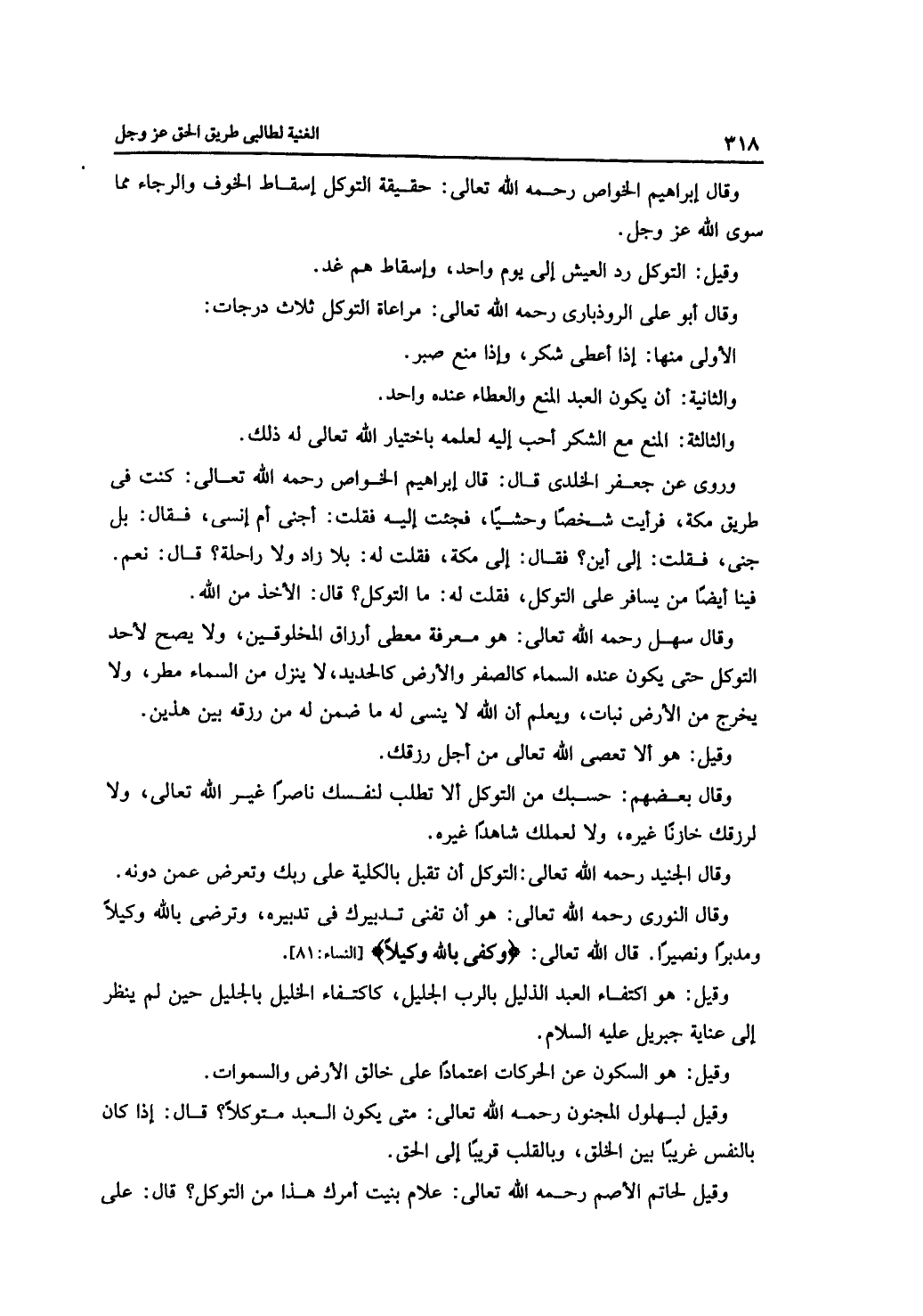 وقال الجنيد رحمه الله تعالى: التوكل أن تقبل بالكلية على ربك وتعرض عمن دونه.