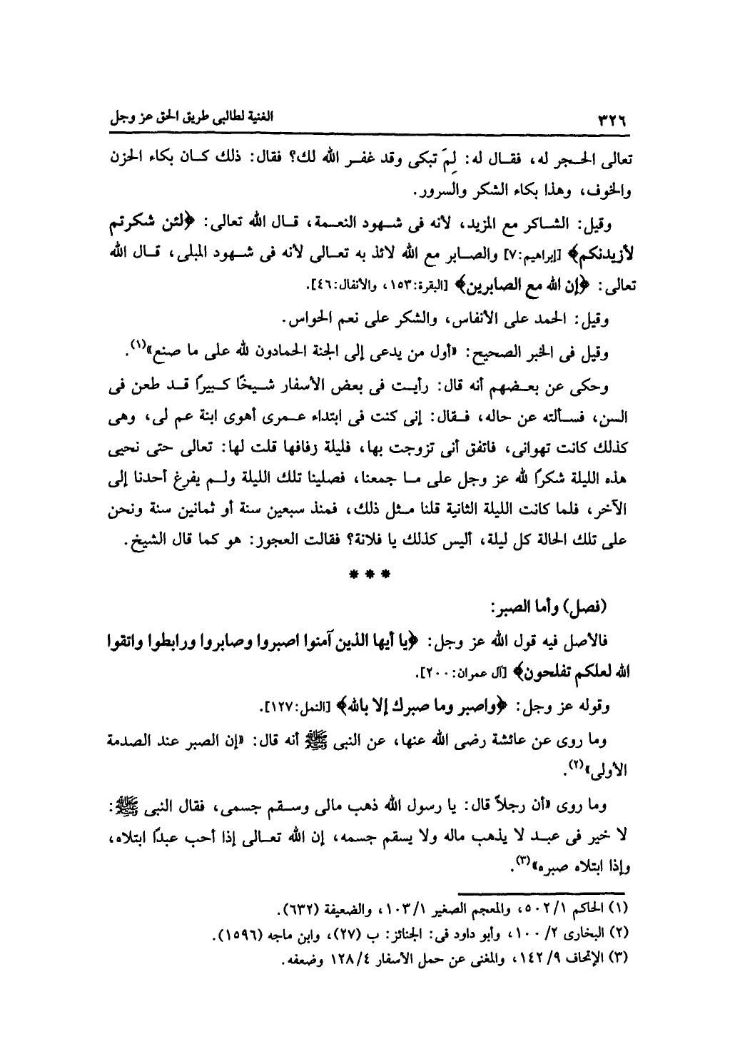 وما روي "أن رجلاً قال: يا رسول الله ذهب مالي وسقم جسمي، فقال النبي -صلى الله عليه وسلم-: لا خير في عبد لا يذهب ماله ولا يسقم جسمه، إن الله تعالى إذا أحب عبدًا ابتلاه، وإذا ابتلاه صبره".