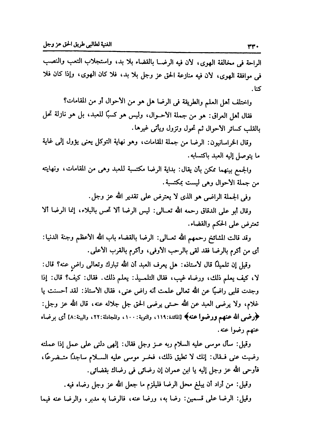 وقيل إن تلميذًا قال لأستاذه: له يعرف العبد أن الله تبارك وتعالى راضٍ عنه؟ قال: لا، كيف يعلم ذلك، ورضاه غيب، فقال التلميذ: يعلم ذلك. فقال: كيف؟ قال: إذا وجدت قلبي راضيًا عن الله تعالى علمت أنه راض عني، فقال الأستاذ: لقد أحسنت يا غلام، ولا يرضى العبد عن الله حتى يرضى الحق جل جلاله عنه، قال الله عز وجل: {رضي الله عنهم ورضوا عنه} [المائدة: 119، والتوبة: 100، والمجادلة: 22، والبينة: 8] أي برضاه عنهم رضوا عنه.