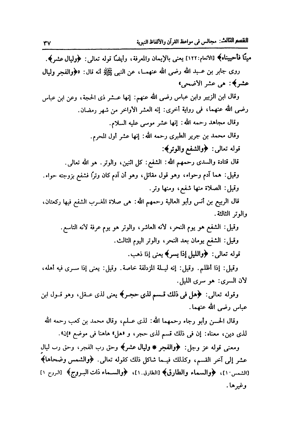 ومعنى قوله -عز وجل -: {والفجر * وليال عشر} وحق رب الفجر، وحق رب ليال عشر إلى آخر القسم، وكذلك فيما شاكل ذلك كقوله تعالى. {والشمس وضحاها} [الشمس: 1]، {والسماء والطارق} [الطارق: 1]، {والسماء ذات البروج} [البروج: 1] وغيرها.