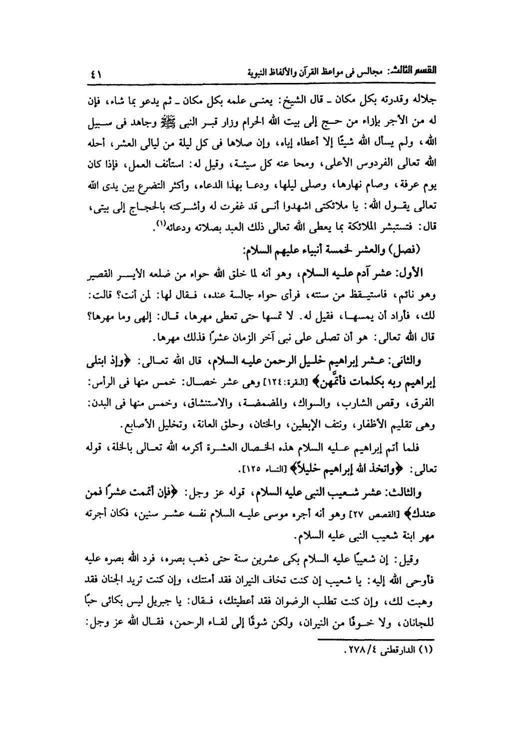 جلاله وقدرته بكل مكان -قال الشيخ: يعني علمه بكل مكان -ثم يدعو بما شاء، فإن له من الأجر بإزاء من حج إلى بيت الله الحرام وزار قبر النبي -صلى الله عليه وسلم -وجاهد في سبيل الله، ولم يسأل الله شيئًا إلا أعطاه إياه، وإن صلاها في كل ليلة من ليالي العشر، أحله الله تعالى الفردوس الأعلى، ومحا عنه كل سيئة، وقيل له: استأنف العمل، فإذا كان يوم عرفة، وصام نهارها، وصلى ليلها، ودعا بهذا الدعاء، وأكثر التضرع بين يدي الله تعالى يقول الله: يا ملائكتي اشهدوا أني قد غفرت له وأشركته بالحجاج إلى بيتي، قال: فتستبشر الملائكة بما يعطى الله تعالى ذلك العبد بصلاته ودعائه.