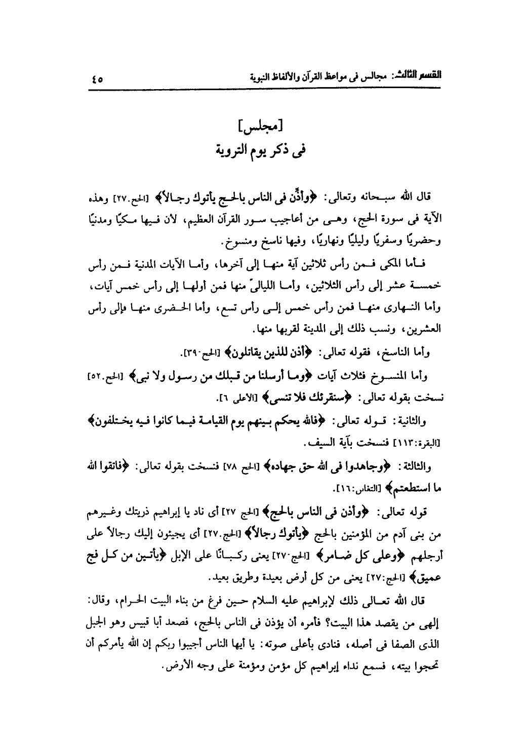 قال الله -سبحانه وتعالى -: {وأذن في الناس بالحج يأتوك رجالاً} [الحج: 27] وهذه الآية في سورة الحج، وهي من أعاجيب سور القرآن العظيم، لأن فيها مكيًا ومدنيًا وحضريًا وسفريًا وليليًا ونهاريًا، وفيها ناسخ ومنسوخ.