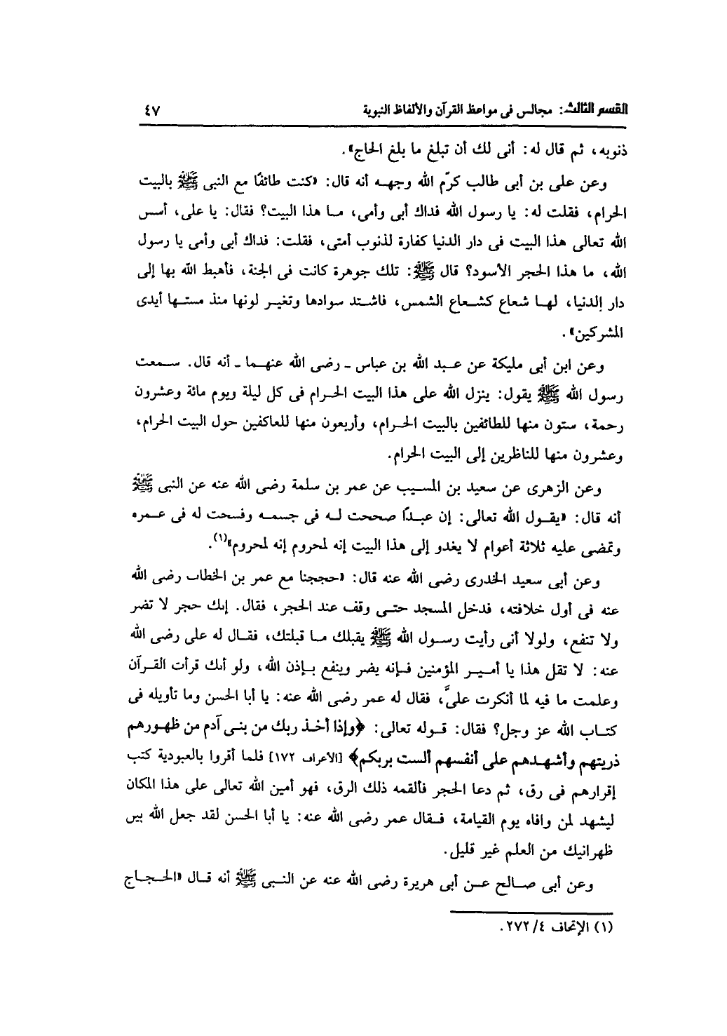 وعن أبى سعيد الخدرى -رضي الله عنه -قال: "حججنا مع عمر بن الخطاب -رضي الله عنه -في أول خلافته، فدخل المسجد حتى وقف عند الحجر، فقال: إنك حجر لا تضر ولا تنفع، ولولا أني رأيت رسول الله -صلى الله عليه وسلم -يقبلك ما قبلتك، فقال له علي -رضي الله عنه -: لا تقل هذا يا أمير المؤمنين فإنه يضر وينفع بإذن الله، ولو أنك قرأت القرآن وعلمت ما فيه لما أنكرت علي، فقال له عمر -رضي الله عنه -، يا أب الحسن وما تأويله في كتاب الله -عز وجل -؟ فقال: قوله تعالى: {وإذا أخذ ربك من بني آدم من ظهورهم ذريتهم وأشهدهم على أنفسهم ألست بربكم} [الأعراف: 172] فلما أقروا بالعبودية كتب إقرارهم في رق، ثم دعا الحجر فألقمه ذلك الرق، فهو أمين الله تعالى على هذا المكان ليشهد لمن وافاه يوم القيامة، فقال عمر -رضي الله عنه -: يا أبا الحسن لقد جعل الله بين ظهرانيك من العلم غير قليل.
