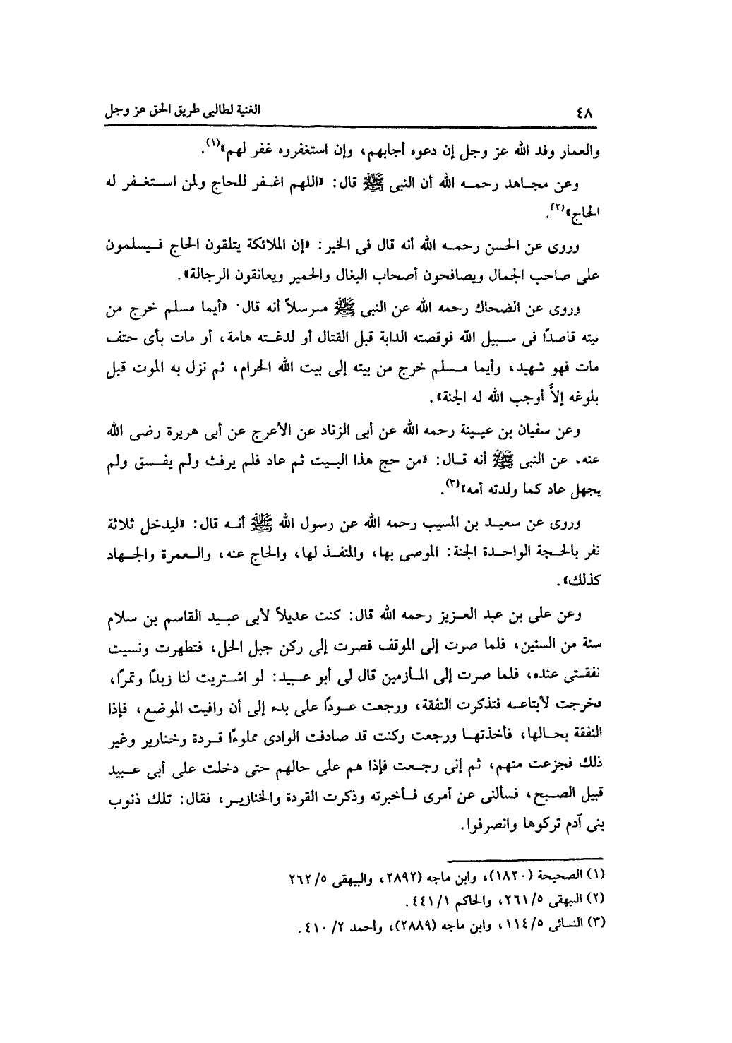 وعن سفيان بن عيينة -رحمه الله -عن أبى الزناد عن الأعرج عن أبى هريرة -رضي الله عنه -، عن النبي -صلى الله عليه وسلم -أنه قال: "من حج هذا البيت ثم عاد فلم يرفث ولم يفسق ولم يجهل عاد كما ولدته أمه".