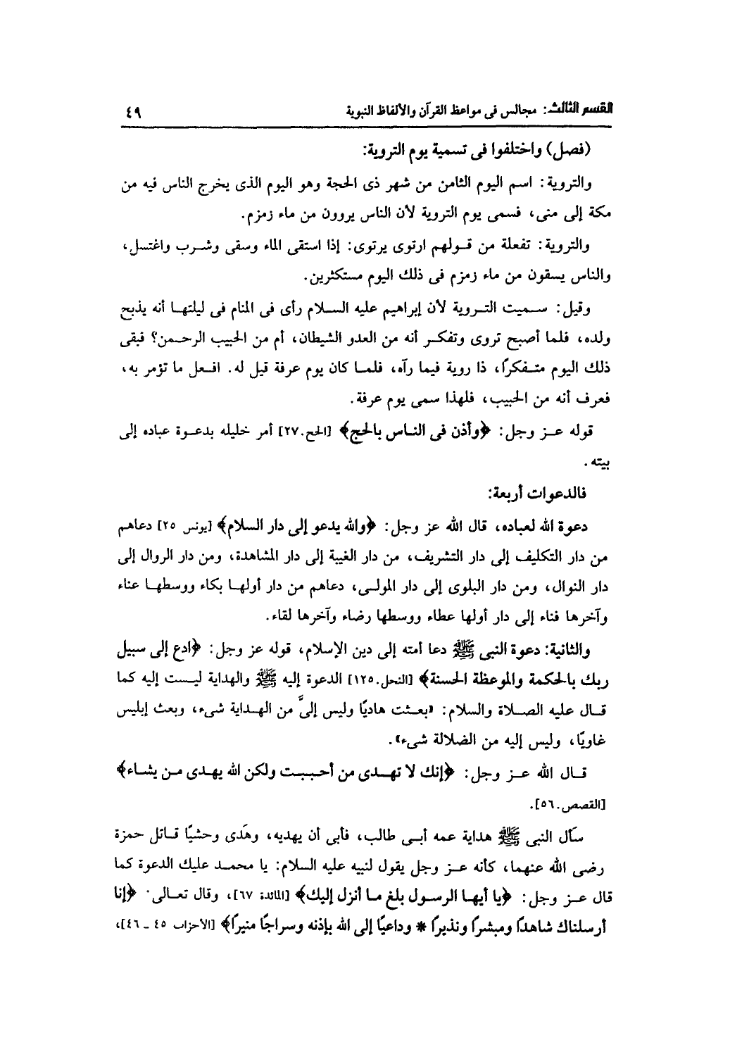 وقيل: سميت التروية لأن إبراهيم -عليه السلام -رأى في المنام في ليلتها أنه يذبح ولده، فلما أصبح تروى وتفكر أنه من العدو الشيطان، أم من الحبيب الرحمن؟ فبقى ذلك اليوم متفكرًا، ذا روية فيما رآه، فلما كان يوم عرفة قيل له. افعل ما تؤمر به، فعرف أنه من الحبيب، فلهذا سمى يوم عرفة.