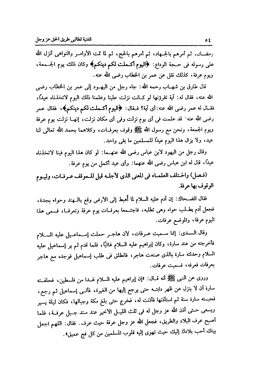 قال طارق بن شهاب -رحمه الله -: جاء رجل من اليهود إلى عمر بن الخطاب -رضي الله عنه-، فقال له: آية تقرؤنها لو كانت نزلت علينا وعلمنا ذلك اليوم لاتخذناه عيدًا، فقال له عمر -رضي الله عنه -: أي آية؟ فقال: {اليوم أكملت لكم دينكم}، فقال عمر -رضي الله عنه -. قد علمت في أي يوم نزلت وفي أي مكان نزلت، إنها نزلت يوم عرفة ويوم الجمعة، ونحن مع رسول الله -صلى الله عليه وسلم -وقوف بعرفات، وكلاهما بحمد الله تعالى لنا عيد، ولا يزال هذا اليوم عيدًا للمسلمين ما بقى واحد.