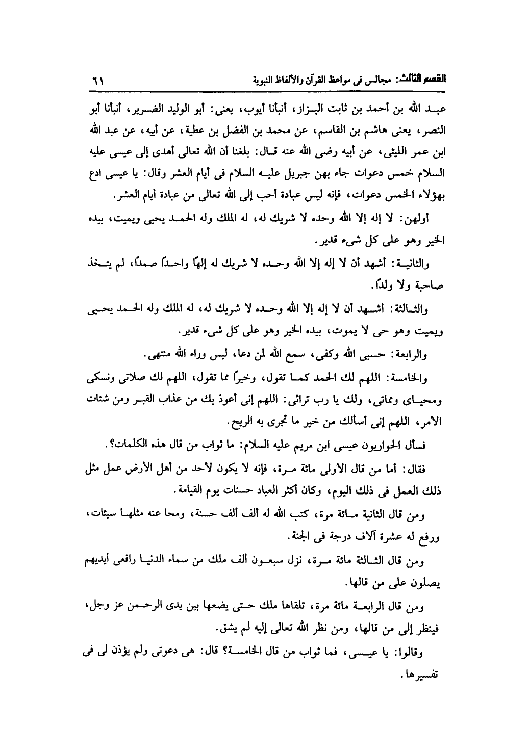 وقالوا: يا عيسى، فما ثواب من قال الخامسة؟ قال: هي دعوتي ولم يؤذن لي في تفسيرها.