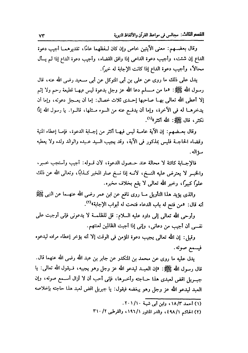 يدل على ذلك ما روى عن علي بن أبى المتوكل عن أبى سعيد -رضي الله عنه -، قال رسول الله -صلى الله عليه وسلم -: "ما مسلم دعا الله -عز وجل -بدعوة ليس فيها قطيعة رحم ولا إثم إلا أعطى الله تعالى بها صاحبها إحدى ثلاث خصال: إما أن يعجل دعوته، وإما أن يدخرها له في الآخرة، وإما أن يدفع عنه من السوء مثلها، قالوا. يا رسول الله إذا نكثر، قال -صلى الله عليه وسلم -: الله أكثر".