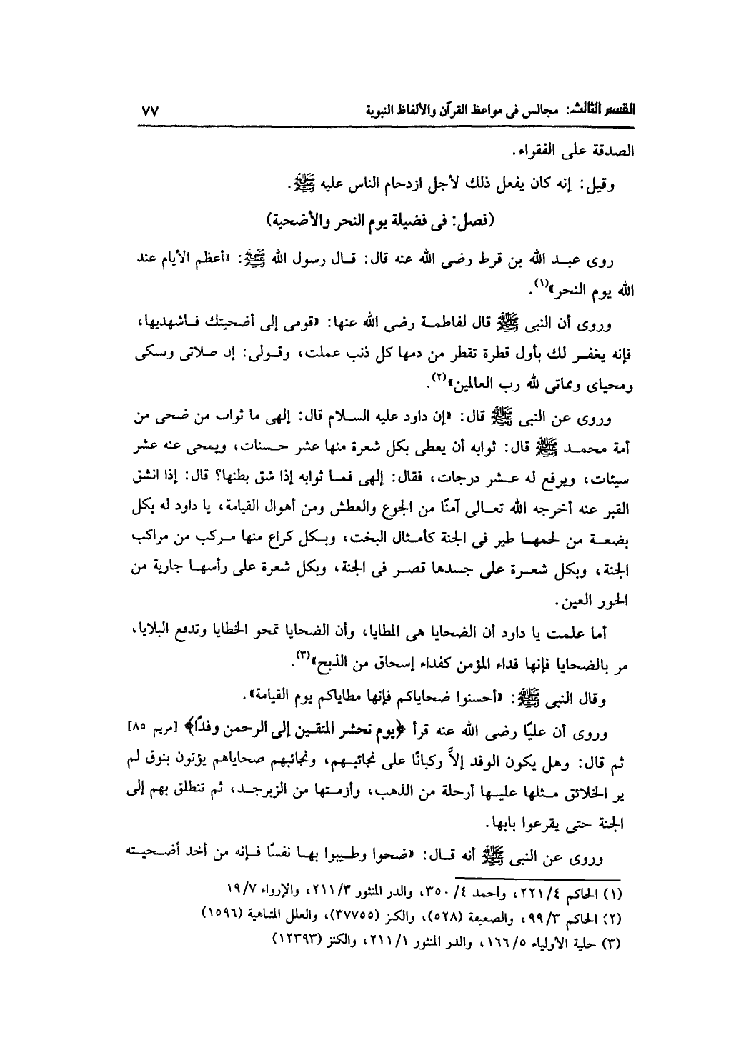 وروى عن النبي -صلى الله عليه وسلم -قال: "إن داود -عليه السلام -قال: إلهي ما ثواب من ضحى من أمة محمد -صلى الله عليه وسلم -قال: ثوابه أن يعطى بكل شعرة منها عشر حسنات، ويمحى عنه عشر سيئات، ويرفع له عشر درجات، فقال: إلهي فما ثوابه إذا شق بطنها؟ قال: إذا انشق القبر عنه أخرجه الله تعالى آمنًا من الجوع والعطش ومن أهوال القيامة، يا داود له بكل بضعة من لحمها طير في الجنة كأمثال البخت، وبكل كراع منها مركب من مراكب الجنة، وبكل شعرة على جسدها قصر في الجنة، وبكل شعرة على رأسها جارية من الحور العين.