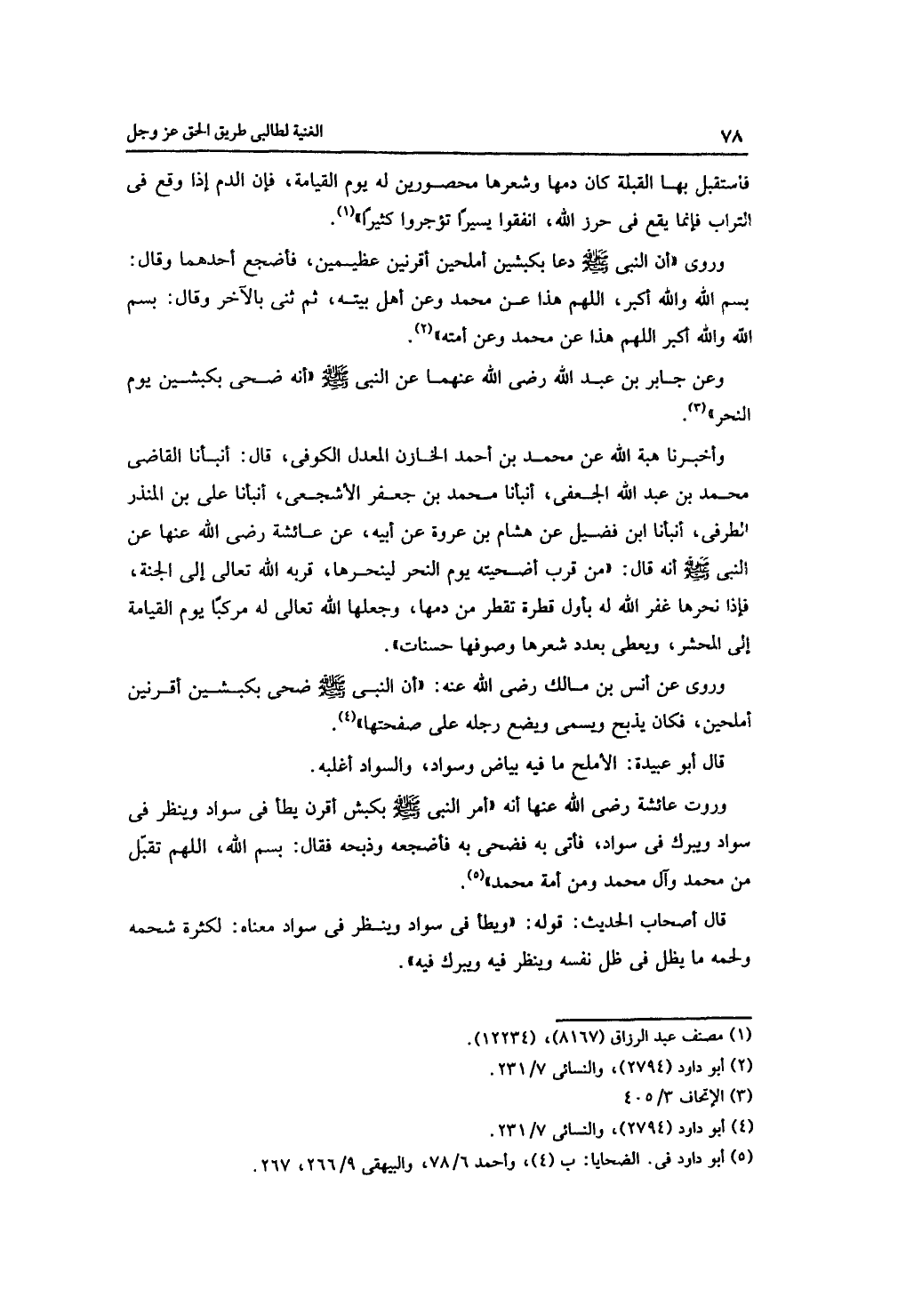 وروى عن أنس بن مالك -رضي الله عنه -: "أن النبي -صلى الله عليه وسلم -ضحى بكبشين أقرنين أملحين، فكان يذبح ويسمى ويضع رجله على صفحتها".