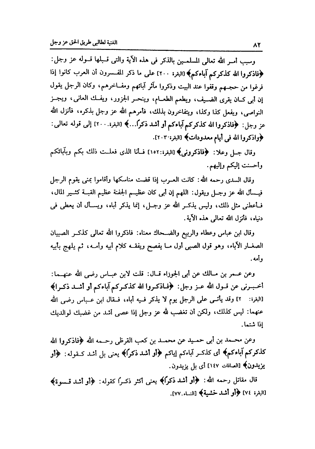 وعن عمر بن مالك عن أبى الجوزاء قال: قلت لابن عباس -رضي الله عنهما -: أخبرني عن قول الله -عز وجل -: {فاذكروا الله كذكركم آباءكم أو أشد ذكرا} البقرة: 2] وقد يأتي على الرجل يوم لا يذكر فيه أباه، فقال ابن عباس -رضي الله عنهما -: ليس كذلك، ولكن أن تغضب لله -عز وجل -إذا عصى أشد من غضبك لوالديك إذا شتما.