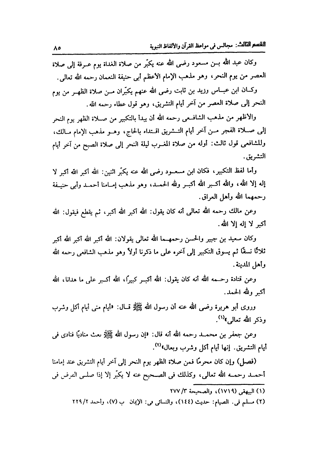 وكان عبد الله بن مسعود -رضي الله عنه -يكبر من صلاة الغداة يوم عرفة إلى صلاة العصر من يوم النحر، وهو مذهب الإمام الأعظم أبى حنيفة النعمان -رحمه الله تعالى -.