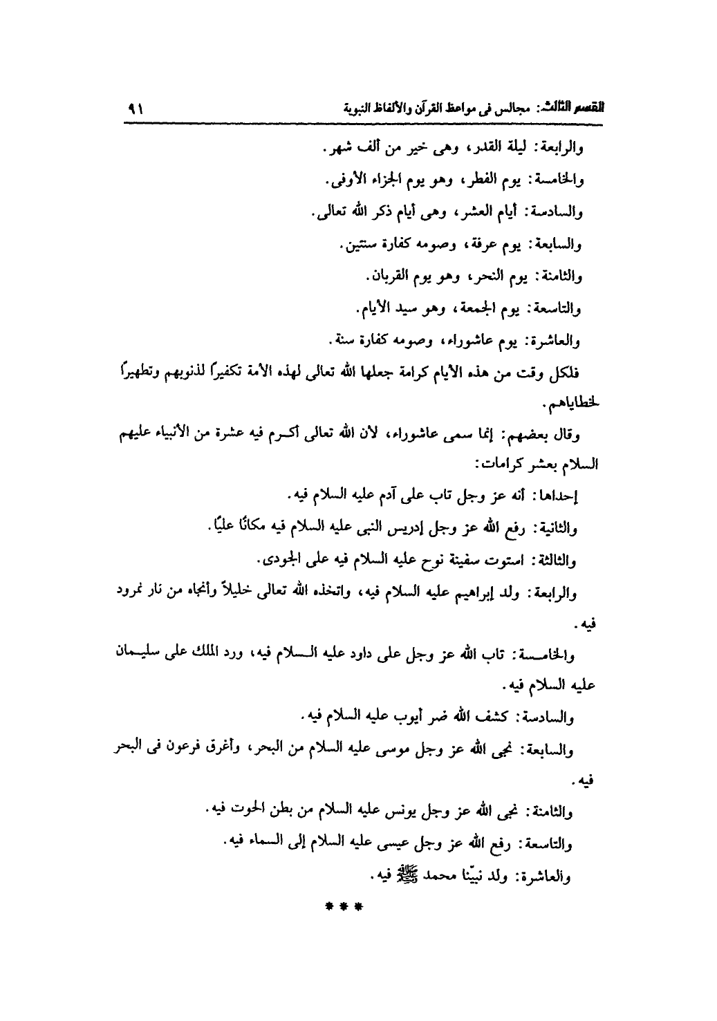 وقال بعضهم: إنما سمى عاشوراء، لأن الله تعالى أكرم فيه عشرة من الأنبياء عليهم السلام بعشر كرامات: