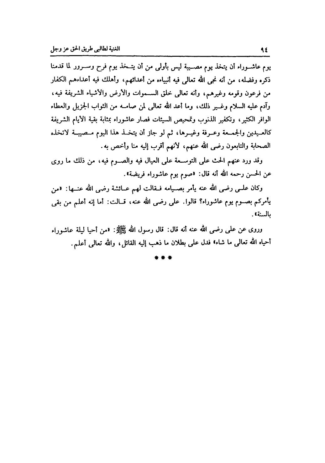 وروى عن علي -رضي الله عنه -أنه قال: قال رسول الله -صلى الله عليه وسلم -: "من أحيا ليلة عاشوراء أحياه الله تعالى ما شاء" فدل على بطلان ما ذهب إليه القائل، والله تعالى أعلم.