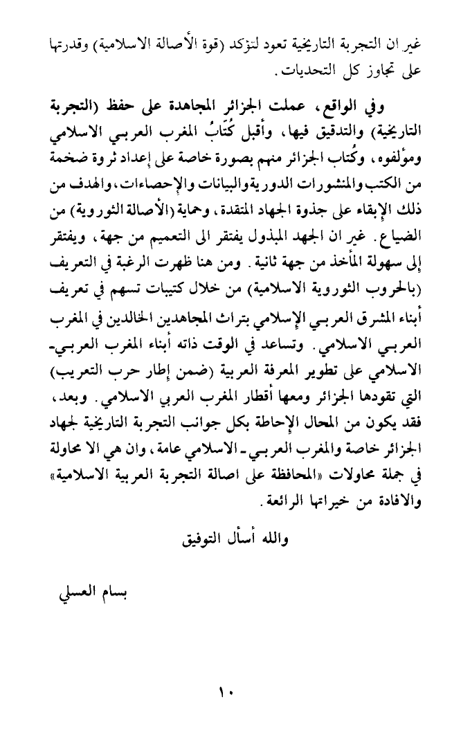 وفي الواقع، عملت الجزائر المجاهدة على حفظ (التجربة التاريخية) والتدقيق فيها، وأقبل كتاب المغرب العربي الإسلامي ومؤلفوه، وكتاب الجزائر منهم بصورة خاصة على إعداد ثروة ضخمة من الكتب والمنشورات الدورية والبيانات والإحصاءات، والهدف من ذلك الإبقاء على جذوة الجهاد المتقدة، وحماية (الأصالة الثوروية) من الضياع. غير أن الجهد المبذول يفتقر إلى التعميم من جهة، ويفتقر إلى سهولة المأخذ من جهة ثانية. ومن هنا ظهرت الرغبة في التعريف (بالحروب الثوروية الإسلامية) من خلال كتيبات تسهم في تعريف أبناء المشرق العربي الإسلامي بتراث المجاهدين الخالدين في المغرب العربي الإسلامي. وتساعد في الوقت ذاته أبناء المغرب العربي- الإسلامي على تطوير المعرفة العربية (ضمن إطار حرب التعريب) التي تقودها الجزائر ومعها أقطار المغرب العربي الإسلامي. وبعد، فقد يكون من المحال الإحاطة بكل جوانب التجربة التاريخية لجهاد الجزائر خاصة والمغرب العربي- الإسلامي عامة، وإن هي إلا محاولة في جملة محاولات (المحافظة على أصالة التجربة العربية الإسلامية، والإفادة من خيراتها الرائعة.