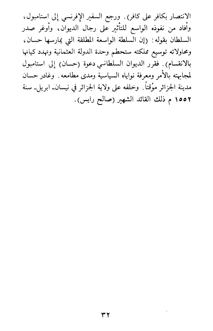 الانتصار بكافر على كافر). ورجع السفير الإفرنسي إلى إستامبول، وأفاد من نفوذه الواسع للتأثير على رجال الديوان، وأوغر صدر السلطان بقوله: (إن السلطة الواسعة المطلقة التي يمارسها حسان، ومحاولاته توسيع مملكته ستحطم وحدة الدولة العثمانية وتهدد كيانها بالانقسام). فقرر الديوان السلطاني دعوة (حسان) إلى إستامبول لمجابهته بالأمر ومعرفة نواياه السياسية ومدى مطامعه. وغادر حسان مدينة الجزائر موقتا. وخلفه على ولاية الجزائر في نيسان - أبريل- سنة 1552 م ذلك القائد الشهير (صالح رايس).
