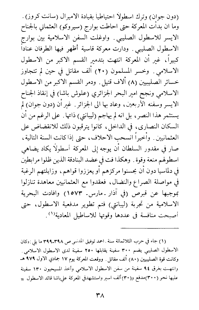 (¬1) جاء في حرب الثلاثمائة سنة. أحمد توفيق المدني ص 398 - 399 ما يلي: (كان الأسطول الصليبي يضم 300 سفينة يقابلها 250 سفينة لدى الأسطول الإسلامي وكانت قوة الصليبيين (80) ألف مقاتل. ووقعت المعركة يوم 17 جادي الأول 979 هـ وانتهت بغرق 94 سفينة من سفن الأسطول الإسلامي وأخذ المسيحيون 130 سفينة عليها نحو (300) مدفع و (30) ألف أسير واستشهد في المعركة علي باشا قائد الأسطول =