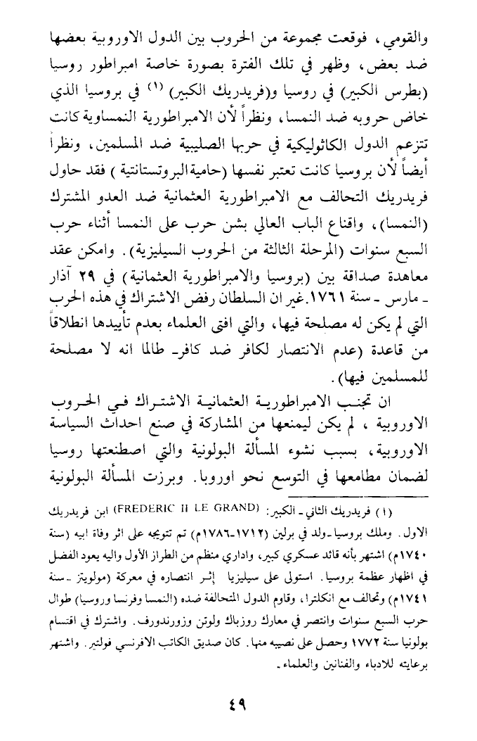 والقومي، فوقعت مجموعة من الحروب بين الدول الأوروبية بعضها ضد بعض، وظهر في تلك الفترة بصورة خاصة إمبراطور روسيا (بطرس الكبير) في روسيا و (فريدريك الكبير) (¬1) في بروسيا الذي خاض حروبه ضد النمسا، ونظرا لأن الإمبراطورية النمساوية كانت تتزعم الدول الكاثوليكية في حربها الصليبية ضد المسلمين، ونظرا أيضا لأن بروسيا كانت تعتبر نفسها (حامية البروتستانتية) فقد حاول فريدريك التحالف مع الإمبراطورية العثمانية ضد العدو المشترك (النمسا)، وإقناع الباب العالي بشن حرب على النمسا أثناء حرب السبع سنوات (المرحلة الثالثة من الحروب السيليزية). وأمكن عقد معاهدة صداقة بين (بروسيا والإمبراطورية العثمانية) في 29 آذار - مارس - سنة 1761.غير أن السلطان رفض الإشتراك في هذه الحرب التي لم يكن له مصلحة فيها، والتي أفتى العلماء بعدم تأييدها انطلاقا من قاعدة (عدم الانتصار لكافر ضد كافر - طالما أنه لا مصلحة للمسلمين فيها).