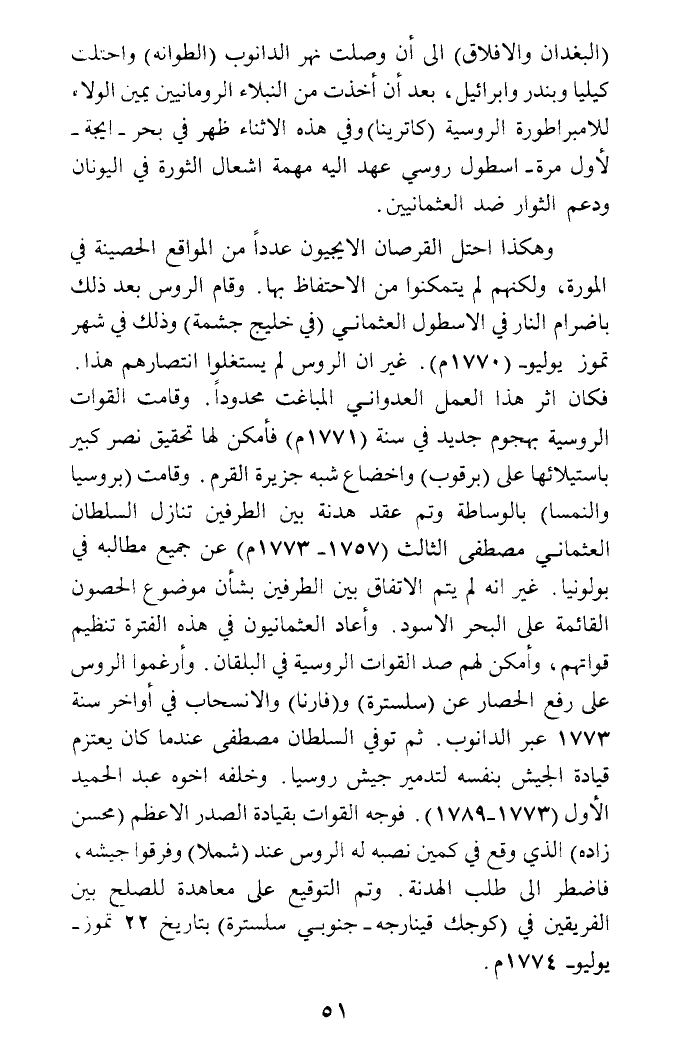 (البغدان والافلاق) إلى أن وصلت نهر الدانوب (الطوانه) واحتلت كيليا وبندر وابرائيل، بعد أن أخذت من النبلاء الرومانيين يمين الولاء للإمبراطورة الروسية (كاترينا) وفي هذه الأثناء ظهر في بحر - إيجة - لأول مرة - أسطول روسي عهد إليه مهمة إشعال الثورة في اليونان ودعم الثوار ضد العثمانيين.