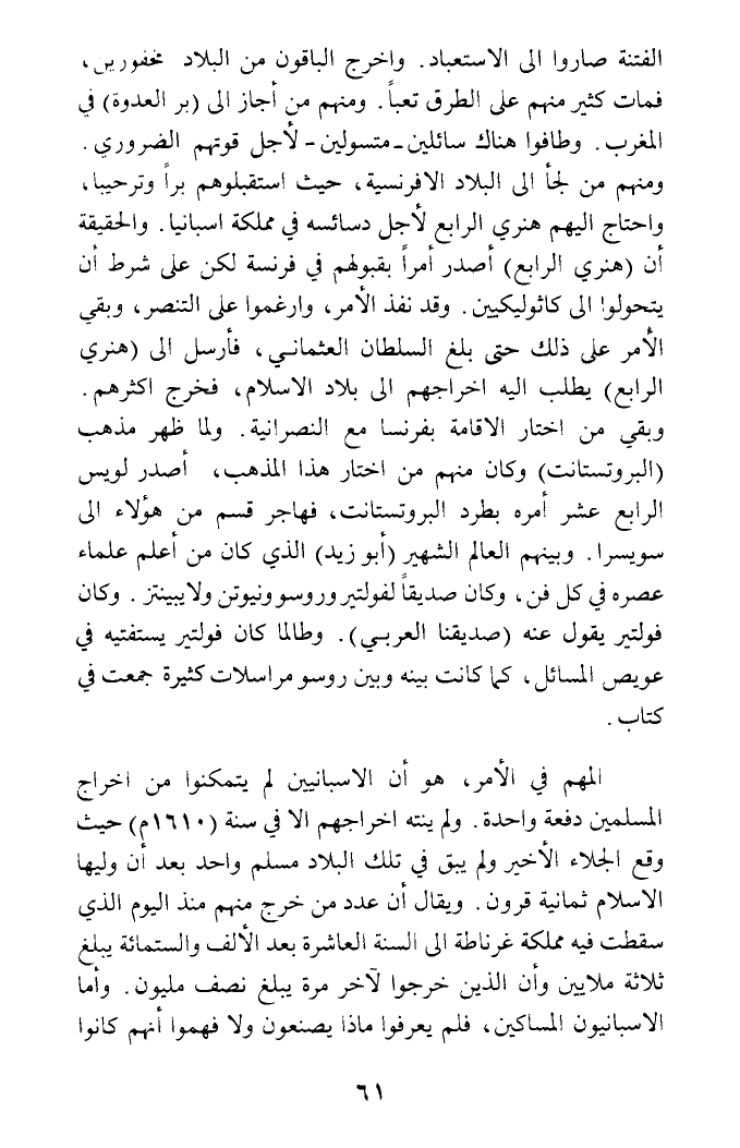 الفتنة صاروا إلى الاستعباد. وأخرج الباقون من البلاد مخفورين، فمات كثير منهم على الطرق تعبا. ومنهم من أجاز إلى (بر العدوة) في المغرب. وطافوا هناك سائلين - متسولين - لأجل قوتهم الضروري. ومنهم من لجأ إلى البلاد الإفرنسية، حيث استقبلوهم برا وترحيبا، واحتاج إليهم هنري الرابع لأجل دسائسه في مملكة إسبانيا. والحقيقة أن (هنري الرابع) أصدر أمرا بقبولهم في فرنسة لكن على شرط أن يتحولوا إلى كاثوليكيين. وقد نفذ الأمر، وأرغموا على التنصر، وبقي الأمر على ذلك حتى بلغ السلطان العثماني، فأرسل إلى (هنري الرابع) يطلب إليه إخراجهم إلى بلاد الإسلام، فخرج أكثرهم. وبقي من اختار الإقامة بفرنسا مع النصرانية. ولما ظهر مذهب (البروتستانت) وكان منهم من اختار هذا المذهب، أصدر لويس الرابع عشر أمره بطرد البروتستانت، فهاجر قسم من هؤلاء إلى سويسرا. وبينهم العالم الشهير (أبو زيد) الذي كان من أعلم علماء عصره في كل فن، وكان صديقا لفولتير وروسو ونيوتن ولايبينتز. وكان فولتر يقول عنه (صديقنا العربي). وطالما كان فولتير يستفتيه في عويص المسائل، كما كانت بينه وبين روسو مراسلات كثيرة جمعت في كتاب.