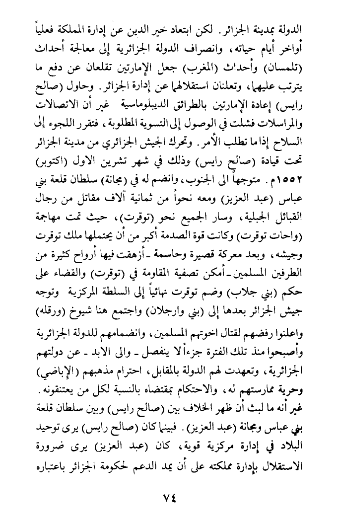 الدولة بمدينة الجزائر. لكن ابتعاد خير الدين عن إدارة المملكة فعليا أواخر أيام حياته، وانصراف الدولة الجزائرية إلى معالجة أحداث (تلمسان) وأحداث (المغرب) جعل الإمارتين تقلعان عن دفع ما يترتب عليها، وتعلنان استقلالها عن إدارة الجزائر. وحاول (صالح رايس) إعادة الإمارتين بالطرائق الديبلوماسية غير أن الاتصالات والمراسلات فشلت في الوصول إلى التسوية المطلوبة، فتقرر اللجوء إلى السلاح إذا ما تطلب الأمر. وتحرك الجيش الجزائري من مدينة الجزائر تحت قيادة (صالح رايس) وذلك في شهر تشرين الأول (أكتوبر) 1552م. متوجها إلى الجنوب، وانضم له في (مجانة) سلطان قلعة بني عباس (عبد العزيز) ومعه نحوا من ثمانية آلاف مقاتل من رجال القبائل الجبلية، وسار الجميع نحو (توقرت)، حيث تمت مهاجمة (واحات توقرت) وكانت قوة الصدمة أكبر من أن يحتملها ملك توقرت وجيشه، وبعد معركة قصيرة وحاسمة - أزهقت فيها أرواح كثيرة من الطرفين المسلمين - أمكن تصفية المقاومة في (توقرت) والقضاء على حكم (بني جلاب) وضم توقرت نهائيا إلى السلطة المركزية وتوجه جيش الجزائر بعدها إلى (بني وارجلان) واجتمع هنا شيوخ (ورقله) وأعلنوا رفضهم لقتال إخوتهم المسلمين، وانضمامهم للدولة الجزائرية وأصبحوا منذ تلك الفترة جزءا لا ينفصل - وإلى الأبد - عن دولتهم الجزائرية، وتعهدت لهم الدولة بالمقابل، احترام مذهبهم (الإباضي) وحرية ممارستهم له، والاحتكام بمقتضاه بالنسبة لكل من يعتنقونه. غير أنه ما لبث أن ظهر الخلاف بين (صالح رايس) وبين سلطان قلعة بني عباس ومجانة (عبد العزيز). فبينما كان (صالح رايس) يرى توحيد البلاد في إدارة مركزية قوية، كان (عبد العزيز) يرى ضرورة الاستقلال بإدارة مملكته على أن يمد الدعم لحكومة الجزائر باعتباره