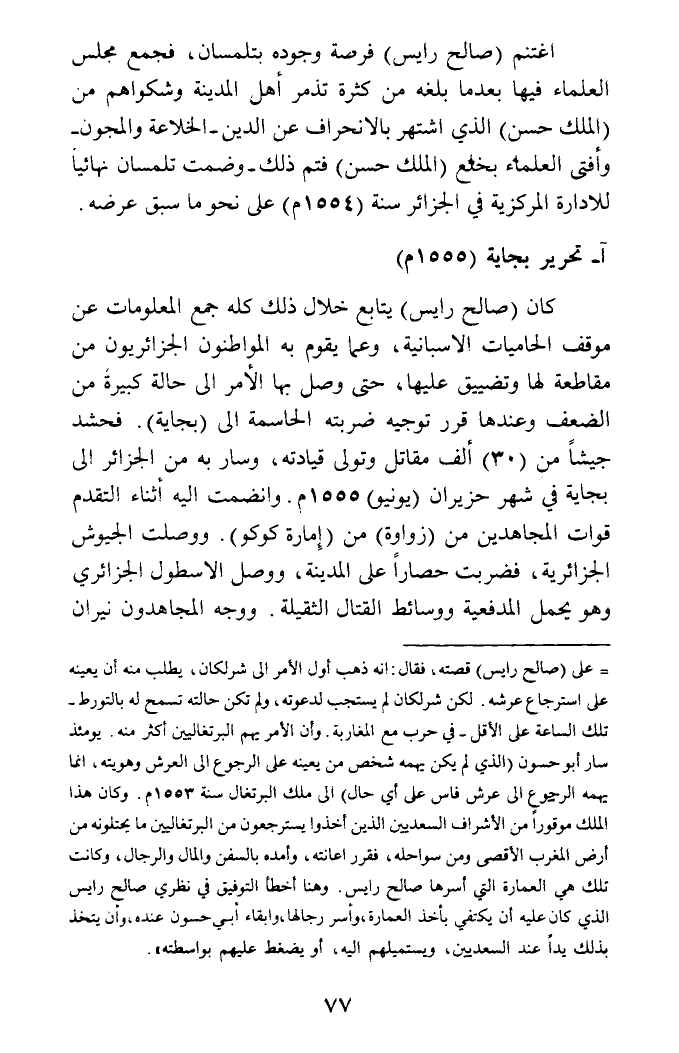 = على (صالح رايس) قصته، فقال: أنه ذهب أول الأمر إلى شرلكان، يطلب منه أن يعينه على استرجاع عرشه. لكن شرلكان لم يستجب لدعوته، ولم تكن حالته تسمح له بالتورط - تلك الساعة على الأقل - في حرب مع المغاربة. وأن الأمر يهم البرتغاليين أكثر منه. يومئذ سار أبو حسون (الذي لم يكن يهمه شخص من يعينه على الرجوع إلى العرش وهويته، إنما يهمه الرجوع إلى عرش فاس على أي حال) إلى ملك البرتغال سنة 1553م. وكان هذا الملك موقورا من الأشراف السعديين الذين أخذوا يسترجعون من البرتغاليين ما يحتلونه من أرض المغرب الأقصى ومن سواحله، فقرر إعانته، وأمده بالسفن والمال والرجال، وكانت تلك هي العمارة التي أسرها صالح رايس. وهنا أخطأ التوفيق في نظري صالح رايس الذي كان عليه أن يكتفي بأخذ العمارة، وأسر رجالها، وإبقاء أبي حسون عنده، وأن يتخذ بذلك يدا عند السعديين، ويستميلهم إليه، أو يضغط عليهم بواسطته).