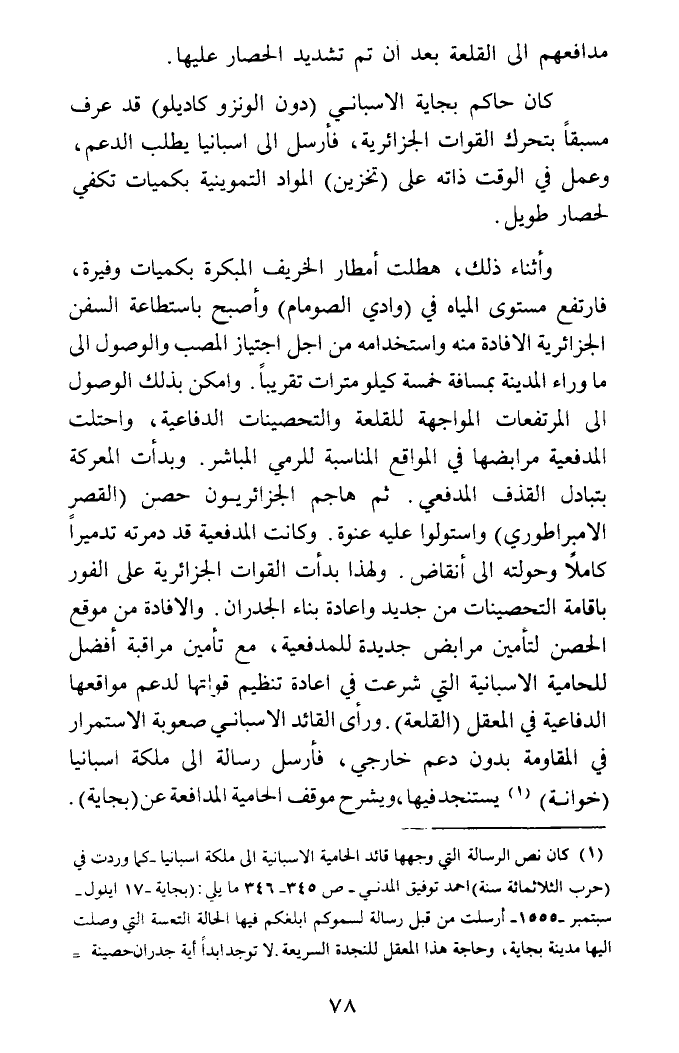 (¬1) كان نص الرسالة التي وجهها قائد الحامية الإسبانية إلى ملكة إسبانيا - كما وردت في (حرب الثلاثمائة سنة) أحمد توفيق المدني. ص 345 - 346 ما يلي: (بجاية - 17 أيلول - سبتمبر - 1555 - أرسلت من قبل رسالة لسموكم أبلغكم فيها الحالة التعسة التي وصلت إليها مدينة بجاية، وحاجة هذا المعقل للنجدة السريعة. لا توجد أبدا أية جدران حصينة =