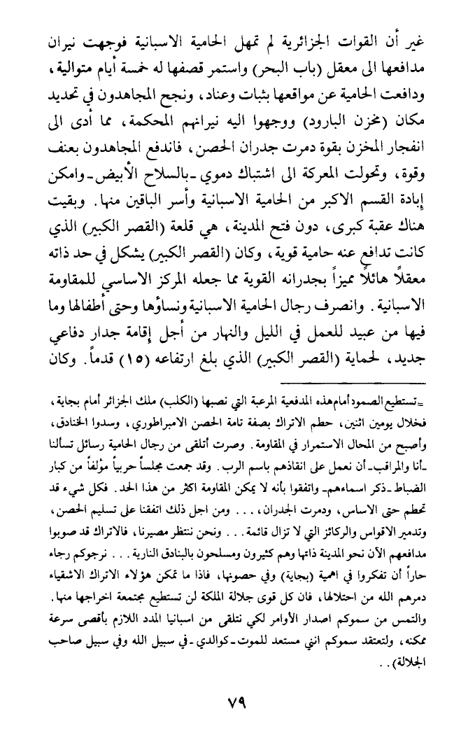 = تستطيع الصمود أمام هذه المدفعية المرعبة التي نصبها (الكلب) ملك الجزائر أمام بجاية، فخلال يومين اثنين، حطم الأتراك بصفة تامة الحصن الإمبراطوري، وسدوا الخنادق، وأصبح من المحال الاستمرار في المقاومة. وصرت أتلقى من رجال الحامية رسائل تسألنا - أنا والمراقب - أن نعمل على إنقاذهم باسم الرب. وقد جمعت مجلسا حربيا مؤلفا من كبار الضباط - ذكر أسماءهم - واتفقوا بأنه لا يمكن المقاومة أكثر من هذا الحد. فكل شيء قد تحطم حتى الأساس، ودمرت الجدران، ... ومن أجل ذلك اتفقنا على تسليم الحصن، وتدمير الأقواس والركائز التي لا تزال قائمة ... ونحن ننتظر مصيرنا، فالأتراك فد صوبوا مدافعهم الآن نحو المدينة ذاتها وهم كثيرون ومسلحون بالبنادق النارية ... نرجوكم رجاء حارا أن تفكروا في أهمية (بجاية) وفي حصونها، فإذا ما تمكن هؤلاء الأتراك الاشقياء دمرهم الله من احتلالها، فإن كل قوى جلالة الملكة لن تستطيع مجتمعة إخراجها منها. وألتمس من سموكم إصدار الأوامر لكي نتلقى من إسبانيا المدد اللازم بأقصى سرعة ممكنه، ولتعتقد سموكم أنني مستعد للموت - كوالدي - في سبيل الله وفي سبيل صاحب الجلالة) ..