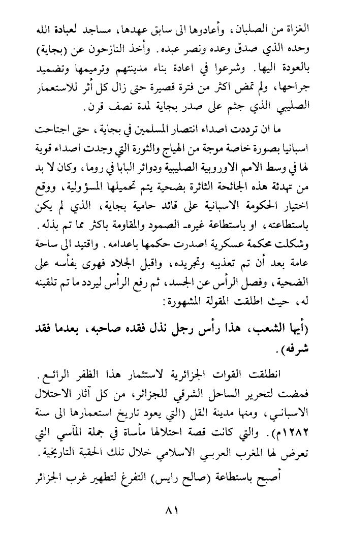 الغزاة من الصلبان، وأعادوها إلى سابق عهدها، مساجد لعبادة الله وحده الذي صدق وعده ونصر عبده. وأخذ النازحون عن (بجاية) بالعودة إليها. وشرعوا في إعادة بناء مدينتهم وترميمها وتضميد جراحها، ولم تمض أكثر من فترة قصيرة حتى زال كل أثر للاسعمار الصليبي الذي جثم على صدر بجاية لمدة نصف قرن.