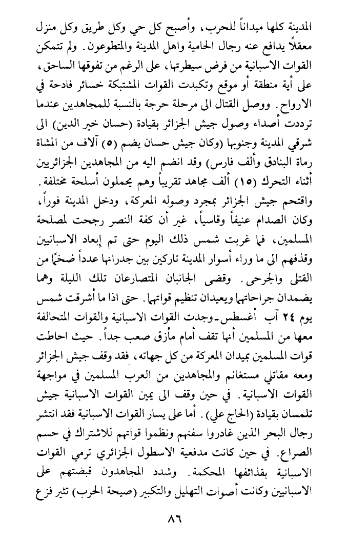 المدينة كلها ميدانا للحرب، وأصبح كل حي وكل طريق وكل منزل معقلا يدافع عنه رجال الحامية وأهل المدينة والمتطوعون. ولم تتمكن القوات الإسبانية من فرض سيطرتها، على الرغم من تفوقها الساحق، على أية منطقة أو موقع وتكبدت القوات المشتبكة خسائر فادحة في الأرواح. ووصل القتال إلى مرحلة حرجة بالنسبة للمجاهدين عندما ترددت أصداء وصول جيش الجزائر بقيادة (حسان خير الدين) إلى شرقي المدينة وجنوبها (وكان جيش حسان يضم (5) آلاف من المشاة رماة البنادق وألف فارس) وقد انضم إليه من المجاهدين الجزائريين أثناء التحرك (15) ألف مجاهد تقريبا وهم يحملون أسلحة مختلفة. واقتحم جيش الجزائر بمجرد وصوله المعركة، ودخل المدينة فورا، وكان الصدام عنيفا وقاسيا، غير أن كفة النصر رجحت لمصلحة المسلمين، فما غربت شمس ذلك اليوم حتى تم إبعاد الإسبانيين وقذفهم إلى ما وراء أسوار المدينة تاركين بين جدرانها عددا ضخما من القتلى والجرحى. وقضى الجانبان المتصارعان تلك الليلة وهما يضمدان جراحاتها ويعيدان تنظيم قواتهما. حتى إذا ما أشرقت شمس يوم 24 آب أغسطس - وجدت القوات الإسبانية والقوات المتحالفة معها من المسلمين أنها تقف أمام مأزق صعب جدا. حيث أحاطت قوات المسلمين بميدان المعركة من كل جهاته، فقد وقف جيش الجزائر ومعه مقاتلي مستغانم والمجاهدين من العرب المسلمين في مواجهة القوات الإسبانية. في حين وقف إلى يمين القوات الإسبانية جيش تلمسان بقيادة (الحاج علي). أما على يسار القوات الإسبانية فقد انتشر رجال البحر الذين غادروا سفنهم ونظموا قواتهم للاشتراك في حسم الصراع. في حين كانت مدفعية الأسطول الجزائري ترمي القوات الإسبانية بقذائفها المحكمة. وشدد المجاهدون قبضتهم على الإسبانيين وكانت أصوات التهليل والتكبير (صيحة الحرب) تثير فزع