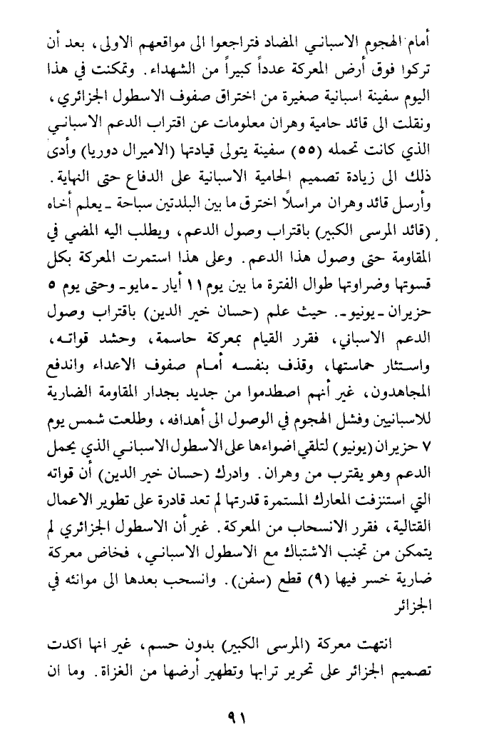 أمام الهجوم الإسباني المضاد فتراجعوا إلى مواقعهم الأولى، بعد أن تركوا فوق أرض المعركة عددا كبيرا من الشهداء , وتمكنت في هذا اليوم سفينة إسبانية صغيرة من اختراق صفوف الأسطول الجزائري، ونقلت إلى قائد حامية وهران معلومات عن اقتراب الدعم الإسباني الذي كانت تحمله (55) سفينة يتولى قيادتها (الأميرال دوريا) وأدى ذلك إلى زيادة تصميم الحامية الإسبانية على الدفاع حتى النهاية. وأرسل قائد وهران مراسلا اخترق ما بين البلدتين سباحة - يعلم أخاه (قائد المرسى الكبير) باقتراب وصول الدعم، ويطلب إليه المضي في المقاومة حتى وصول هذا الدعم. وعلى هذا استمرت المعركة بكل قسوتها وضراوتها طوال الفترة ما بين يوم 11 أيار - مايو - وحتى يوم 5 حزيران - يونيو -. حيث علم (حسان خير الدين) باقتراب وصول الدعم الإسباني، فقرر القيام بمعركة حاسمة، وحشد قواته، واستثار حماستها؛ وقذف بنفسه أمام صفوف الأعداء واندفع المجاهدون، غير أنهم اصطدموا من جديد بجدار المقاومة الضارية للإسبانيين وفشل الهجوم في الوصول إلى أهدافه، وطلعت شمس يوم 7 حزيران (يونيو) لتلقي أضواءها على الأسطول الإسباني الذي يحمل الدعم وهو يقترب من وهران. وأدرك (حسان خير الدين) أن قواته التي استنزفت المعارك المستمرة قدرتها لم تعد قادرة على تطوير الأعمال القتالية، فقرر الانسحاب من المعركة. غير أن الأسطول الجزائري لم يتمكن من تجنب الاشتباك مع الأسطول الإسباني، فخاض معركة ضارية خسر فيها (9) قطع (سفن). وانسحب بعدها إلى موانئه في الجزائر.