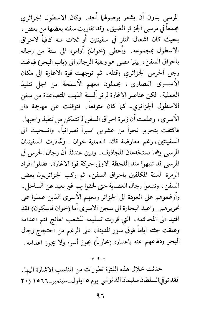 المرسى بدون أن يشعر بوصولها أحد. وكان الأسطول الجزائري مجمعا في مرسى الجزائر الضيق، وقد تقاربت سفنه بعضها من بعض، بحيث كان إشعال النار في سفينتين أو ثلاث منه كافيا لإحراق الأسطول بمجموعه. وأعطى (خوان) أوامره إلى ستة من رجاله بإحراق السفن، بينما مضى هو وبقية الرجال إلى (باب البحر) فباغت رجل الحرس الجزائري وقتله، ثم توجهت قوة الإغارة إلى مكان الأسرى النصارى، يحملون معهم الأسلحة من أجل تنفيذ العملية. لكن عناصر الإغارة لم تر ألسنة اللهب المتصاعدة من سفن الأسطول الجزائري - كما كان متوقعا. فتوقفت عن مهاجمة دار الأسرى، وعلمت أن زمرة إحراق السفن لم تتمكن من تنفيذ واجبها.