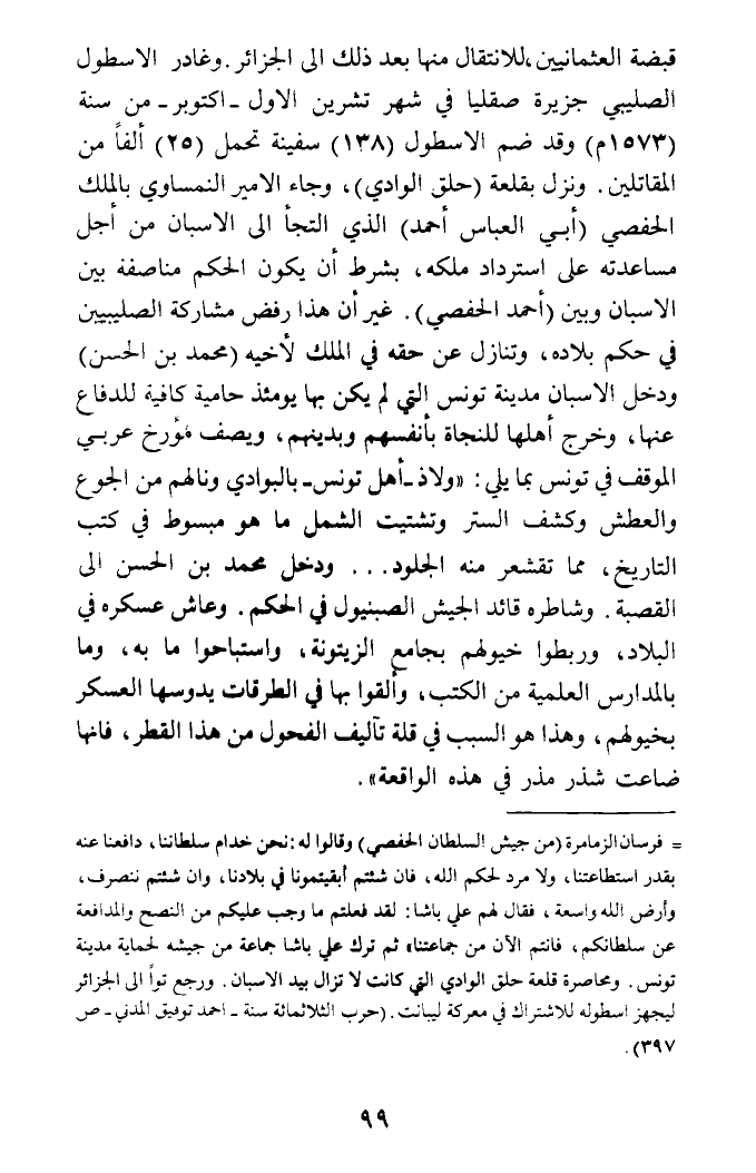 قبضة العثمانيين، للانتقال منها بعد ذلك إلى الجزائر. وغادر الأسطول الصليبي جزيرة صقليا في شهر تشرين الأول - أكتوبر - من سنة (1573م) وقد ضم الأسطول (138) سفينة تحمل (25) ألفا من المقاتلين. ونزل بقلعة (حلق الوادي)، وجاء الأمير النمساوي بالملك الحفصي (أبي العباس أحمد) الذي التجأ إلى الإسبان من أجل مساعدته على إسترداد ملكه، بشرط أن يكون الحكم مناصفة بين الإسبان وبين (أحمد الحفصي). غير أن هذا رفض مشاركة الصليبيين في حكم بلاده، وتنازل عن حقه في الملك لأخيه (محمد بن الحسن) ودخل الإسبان مدينة تونس التي لم يكن بها يومئذ حامية كافية للدفاع عنها، وخرج أهلها للنجاة بأنفسهم وبدينهم، ويصف مؤرخ عربي الموقف في ترنس بما يلي: (ولاذ - أهل تنس - بالبوادي ونالهم من الجوع