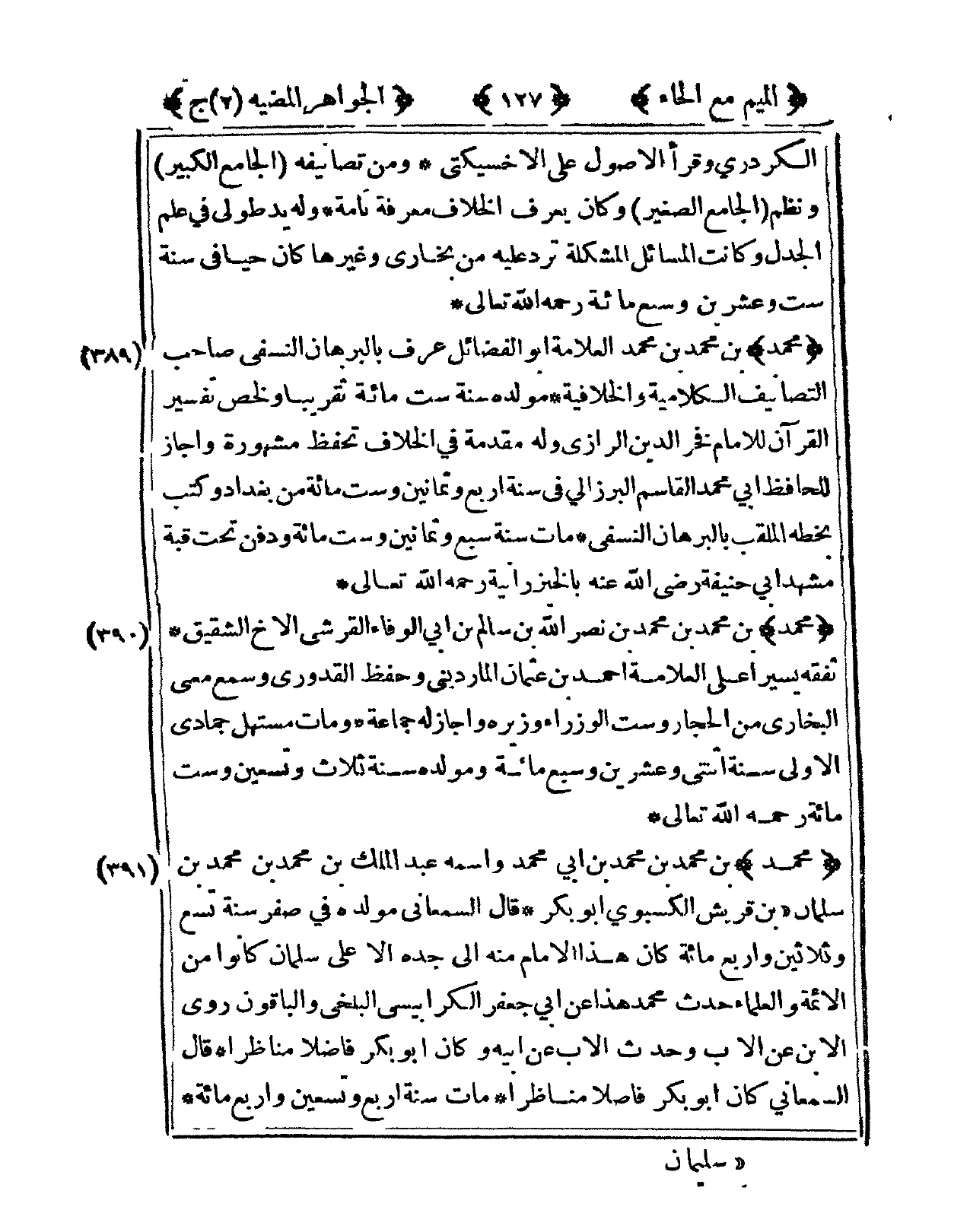389 - مُحَمَّد بن مُحَمَّد بن مُحَمَّد الْعَلامَة أَبُو الْفَضَائِل عرف بالبرهان النَّسَفِيّ صَاحب التصانيف الكلامية والخلافية مولده سنة سِتّ مائَة تَقْرِيبًا ولخص تَفْسِير الْقُرْآن للْإِمَام فَخر الدّين الرزاي وَله مُقَدّمَة فى الْخلاف تحفظ مَشْهُورَة وَأَجَازَ لِلْحَافِظِ أبي مُحَمَّد الْقَاسِم البرزالي فى سنة أَربع وَثَمَانِينَ وست مائَة من بَغْدَاد وَكتب بِخَطِّهِ الملقب بالبرهان النَّسَفِيّ مَاتَ سنة سبع وَثَمَانِينَ وست مائَة وَدفن تَحت قبَّة مشْهد أبي حنيفَة رَضِي الله عَنهُ بالخيزرانية رَحمَه الله تَعَالَى