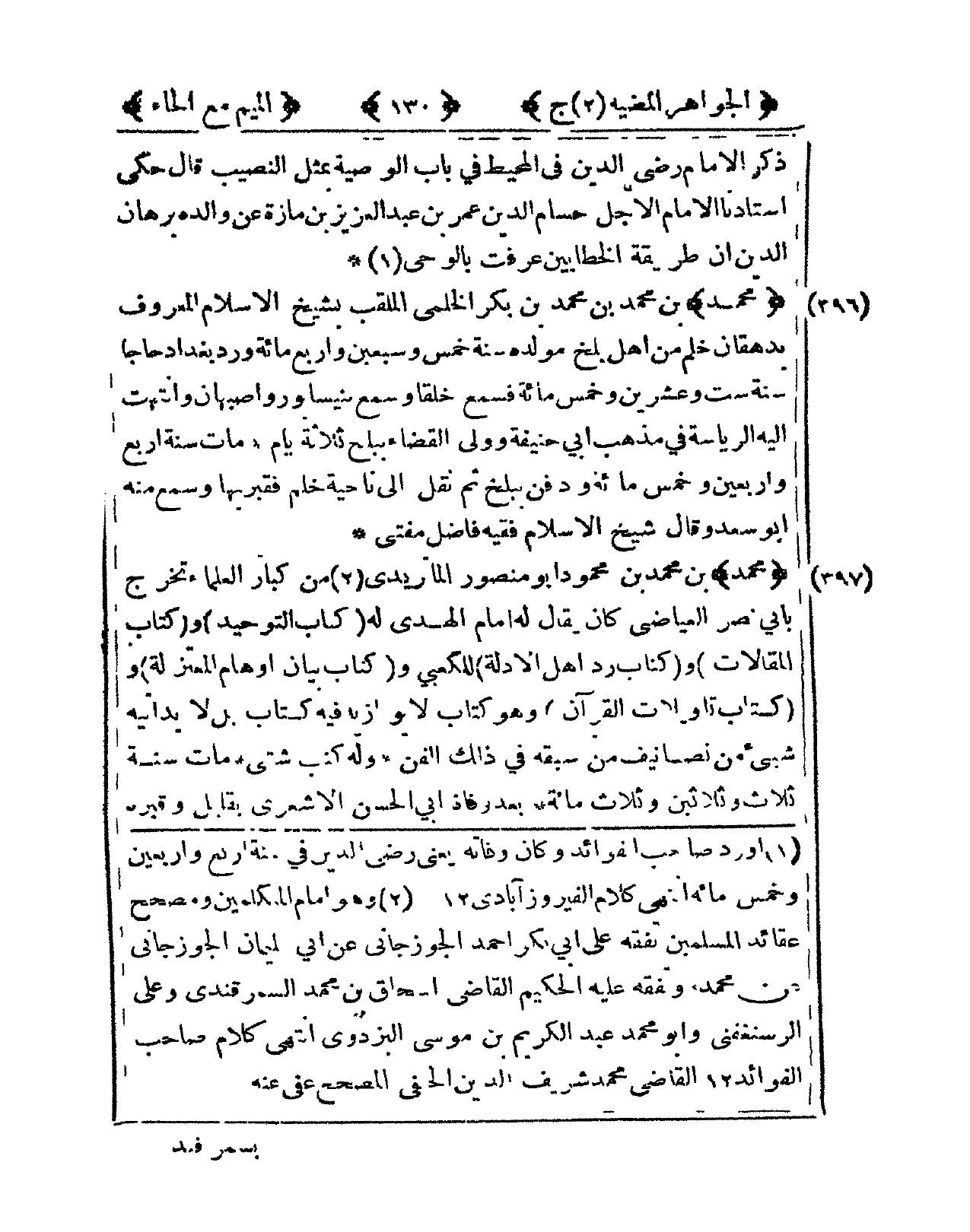 397 - مُحَمَّد بن مُحَمَّد بن مَحْمُود أَبُو مَنْصُور الماتريدي من كبار الْعلمَاء تخرج بِأبي نصر العياضي كَانَ يُقَال لَهُ إِمَام الْهدى لَهُ كتاب التَّوْحِيد وَكتاب المقالات وَكتاب رد أهل الْأَدِلَّة للكعبي وَكتاب بَيَان أَوْهَام الْمُعْتَزلَة وَكتاب تأويلات الْقُرْآن وَهُوَ كتاب لَا يوازيه فِيهِ كتاب بل لَا يدانيه شيئ من تصانيف من سبقه فى ذَلِك الْفَنّ وَله كتب شَتَّى مَاتَ سنة ثَلَاث وَثَلَاثِينَ وَثَلَاث مائَة بعد وَفَاة أبي الْحسن الْأَشْعَرِيّ بِقَلِيل وقبره