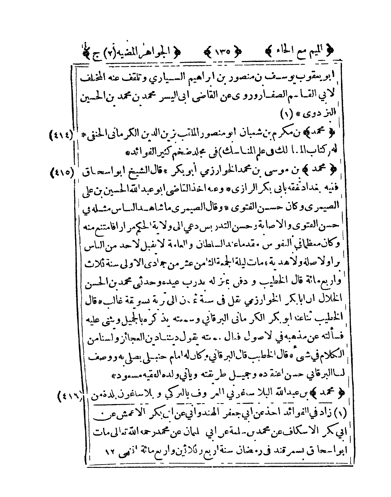 414 - مُحَمَّد بن مكرم بن شعْبَان أَبُو مَنْصُور الملقب بزين الدّين الْكرْمَانِي الْحَنَفِيّ لَهُ كتاب الْمَالِك فى علم الْمَنَاسِك فى مُجَلد ضخم كثير الْفَوَائِد