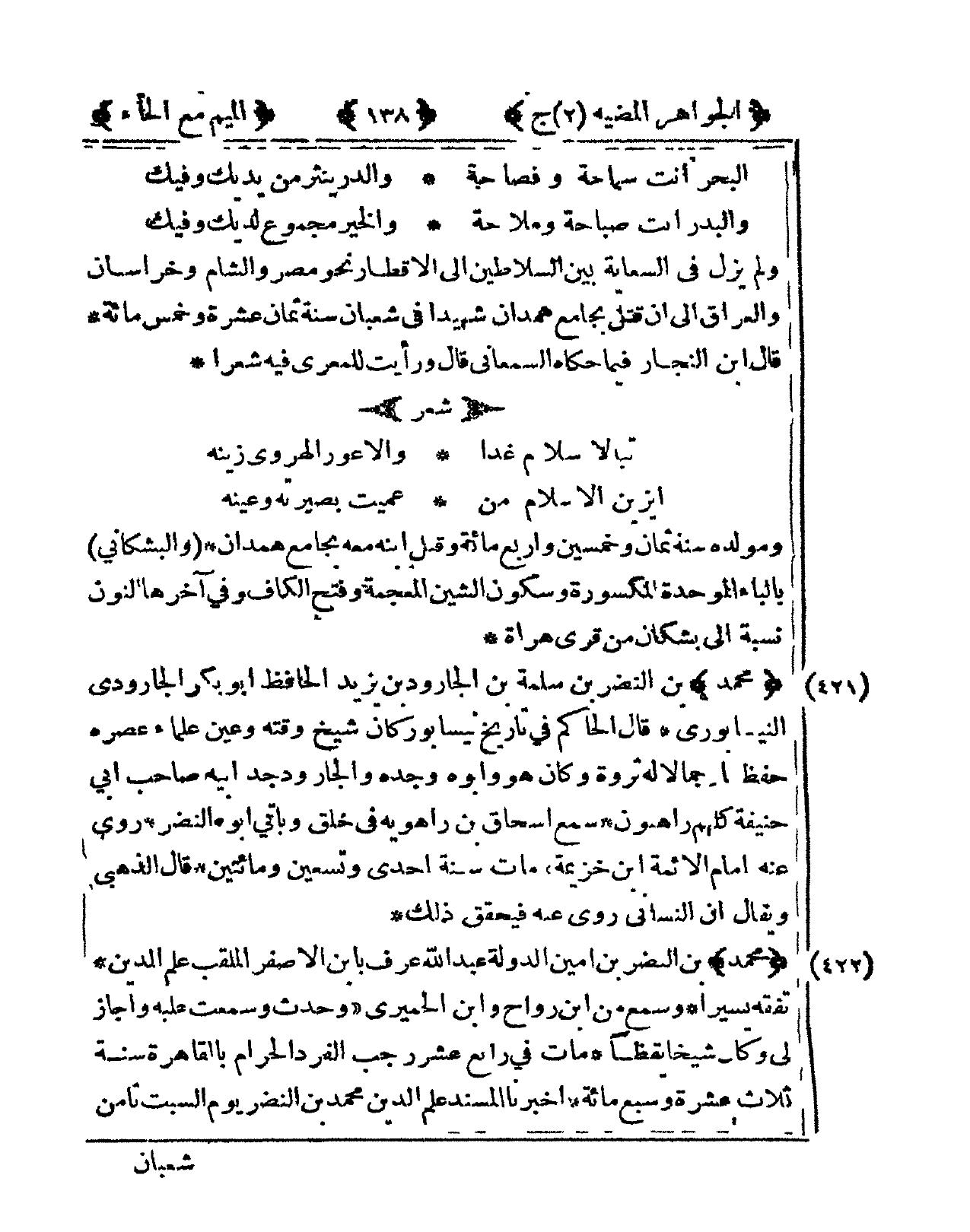 422 - مُحَمَّد بن النَّضر بن أَمِين الدولة عبد الله عرف بإبن الْأَصْفَر الملقب علم الدّين تفقه يَسِيرا وَسمع من ابْن رواح وَابْن الْحِمْيَرِي وَحدث وَسمعت عَلَيْهِ وَأَجَازَ لي وَكَانَ شَيخا يقظا مَاتَ فى رَابِع عشر رَجَب الْفَرد الْحَرَام بِالْقَاهِرَةِ سنة ثَلَاث عشرَة وَسبع مائَة أخبرنَا الْمسند علم الدّين مُحَمَّد بن النَّضر يَوْم السبت ثامن