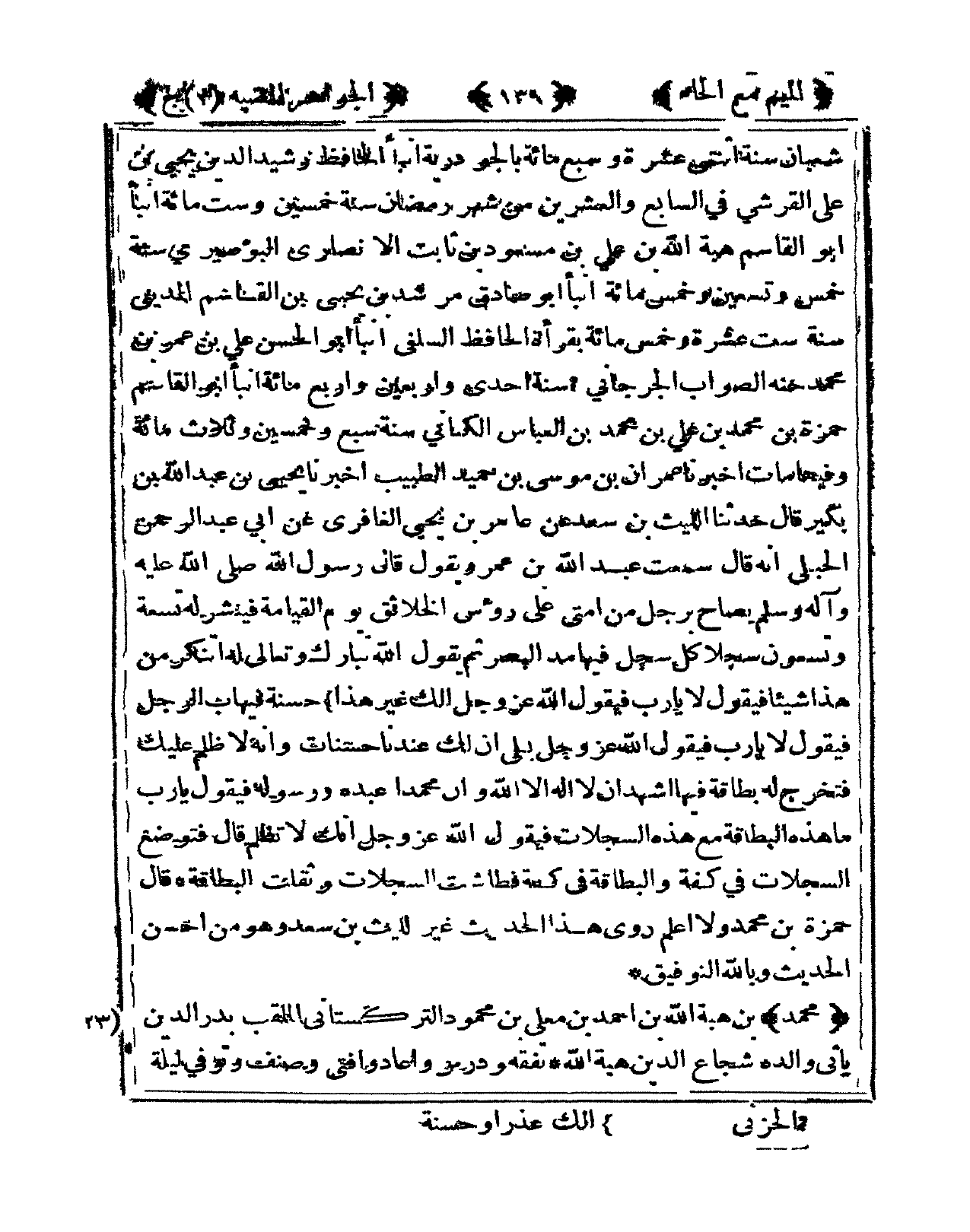 شعْبَان سنة اثنتى عشرَة وَسبع مائَة بالجودرية أنبأ الْحَافِظ رشيد الدّين يحيى بن عَليّ الْقرشِي فى السَّابِع وَالْعِشْرين من شهر رَمَضَان سنة خمسين وست مائَة أنبأ أَبُو الْقَاسِم هبة الله بن عَليّ بن مَسْعُود بن ثَابت الْأنْصَارِيّ البوصيري سنة خمس وَتِسْعين وَخمْس مائَة أنبأ أَبُو صَادِق مرشد بن يحيى بن الْقَاسِم الْمَدِينِيّ سنة سِتّ عشرَة وَخمْس مائَة بقرأة الْحَافِظ السلَفِي أنبأ أَبُو الْحسن عَليّ بن عمر بن مُحَمَّد حنه الصَّوَاب الْجِرْجَانِيّ سنة إِحْدَى وَأَرْبَعين وَأَرْبع مائَة أنبأ أَبُو الْقَاسِم حَمْزَة بن مُحَمَّد بن عَليّ بن مُحَمَّد بن الْعَبَّاس الْكِنَانِي سنة سبع وَخمسين وَثَلَاث مائَة وفيهَا مَاتَ أخبرنَا عمرَان بن مُوسَى بن حميد الطَّبِيب أخبرنَا يحيى بن عبد الله بن بكير قَالَ حَدثنَا اللَّيْث بن سعد عَن عَامر بن يحيى الغافري عَن أبي عبد الرَّحْمَن الْحَنْبَلِيّ أَنه قَالَ سَمِعت عبد الله بن عَمْرو يَقُول قَالَ رَسُول الله صلى الله عَلَيْهِ وَسلم يصاح بِرَجُل من أمتِي على رُؤْس الْخَلَائق يَوْم الْقِيَامَة فينشر لَهُ تِسْعَة وَتسْعُونَ سجلا كل سجل فِيهَا مد الْبَصَر ثمَّ يَقُول الله تبَارك وَتَعَالَى لَهُ أتنكر من هَذَا شَيْئا فَيَقُول لَا يَا رب فَيَقُول الله عز وَجل أَلَك غير هَذَا حَسَنَة فيهاب الرجل فَيَقُول لَا يَا رب فَيَقُول الله عز وَجل بلَى إِن لَك عندنَا حَسَنَات وَأَنه لَا ظلم عَلَيْك فَتخرج لَهُ بطاقة فِيهَا أشهد أَن لَا إِلَه إِلَّا الله وَأَن مُحَمَّدًا عَبده وَرَسُوله فَيَقُول يَا رب مَا هَذِه البطاقة مَعَ هَذِه السجلات فَيَقُول الله عز وَجل إِنَّك لَا تظلم قَالَ فتوضع السجلات فى كفة والبطاقة فى كفة فطاشت السجلات وثقلت البطاقة قَالَ حَمْزَة بن مُحَمَّد وَلَا أعلم روى هَذَا الحَدِيث غير اللَّيْث بن سعد وَهُوَ من أحسن الحَدِيث وَبِاللَّهِ التَّوْفِيق